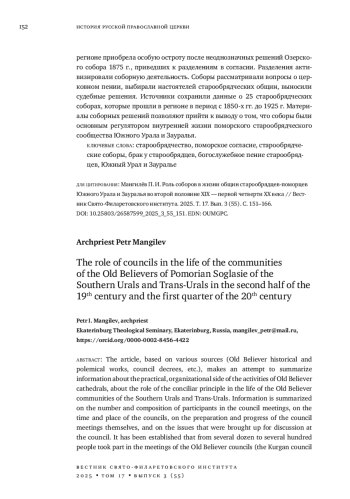20. 	Мангилёв П. И., Олищук В. О. “Возражение последователей Озерского собора” как источник по истории полемики о браке у старообрядцев-поморцев Южного Зауралья // Исторический курьер. 2022. № 2 (22). С. 260-268. DOI: 10.31518/2618-9100-2022-2-17 EDN: ZSGKBB