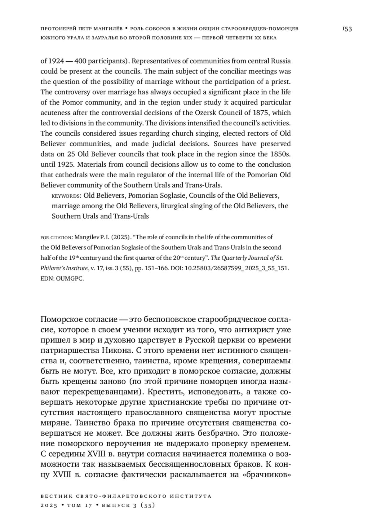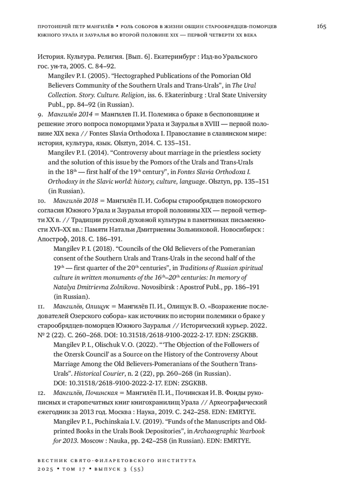 18. 	Мангилев П. И. Полемика о браке в беспоповщине и решение этого вопроса поморцами Урала и Зауралья в XVIII - первой половине XIX века // Fontes Slavia Orthodoxa I. Православие в славянском мире: история, культура, язык. Olsztyn, 2014. С. 135-151.