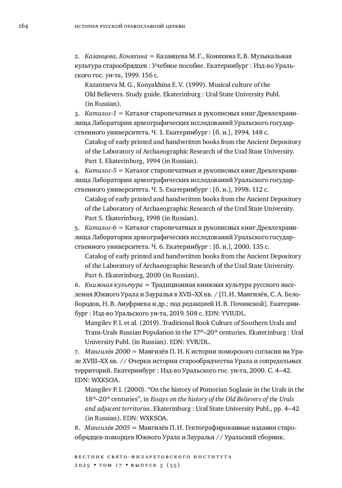 21. 	Мангилёв П. И., Починская И. В. Фонды рукописных и старопечатных книг книгохранилищ Урала // Археографический ежегодник за 2013 год. Москва: Наука, 2019. С. 242-258. EDN: EMRTYE