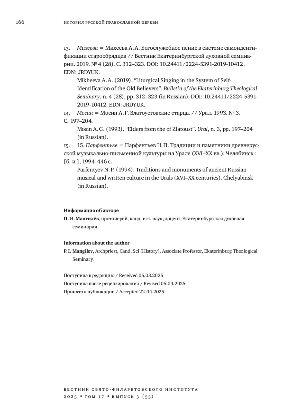 22. 	Михеева А. А. Богослужебное пение в системе самоидентификации старообрядцев // Вестник Екатеринбургской духовной семинарии. 2019. № 4 (28). С. 312-323. DOI: 10.24411/2224-5391-2019-10412 EDN: JRDYUK