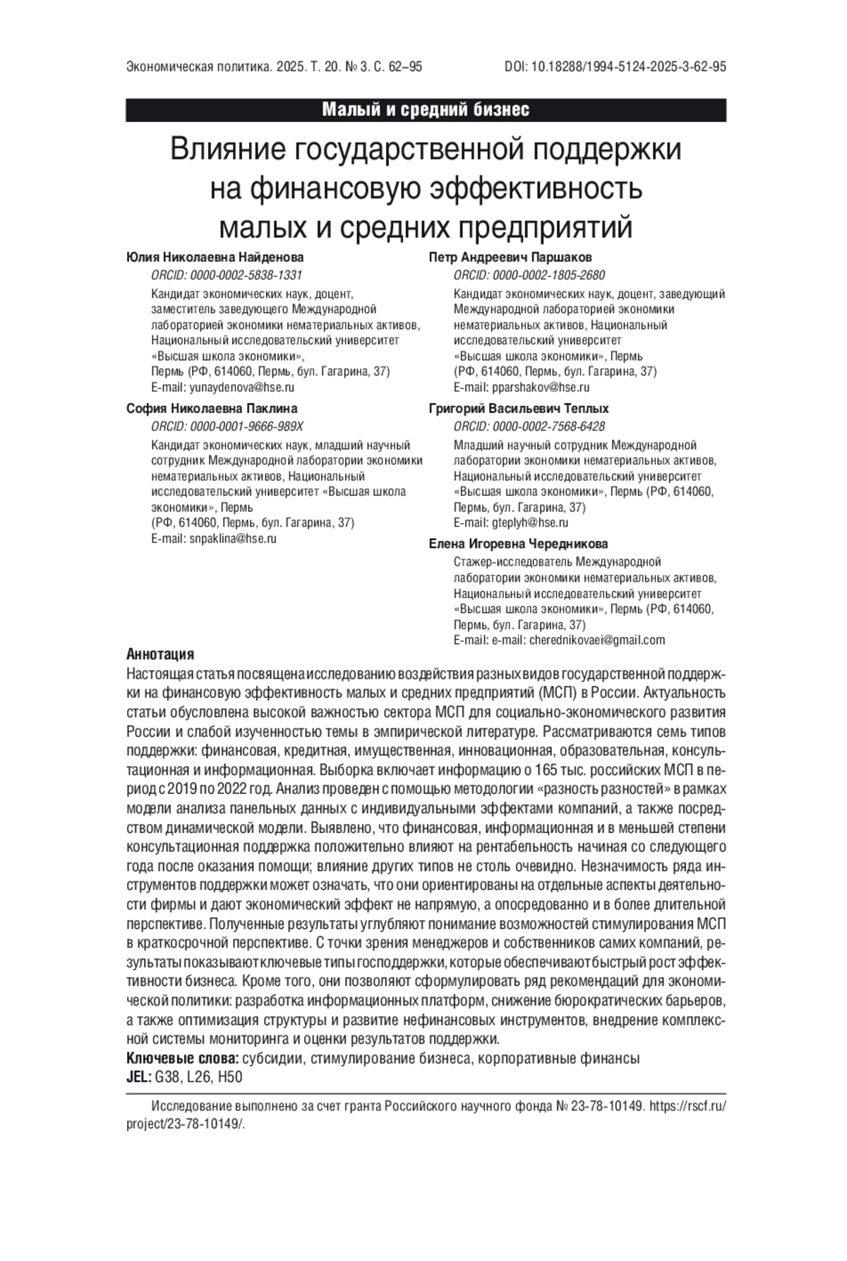 Настоящая статья посвящена исследованию воздействия разных видов государственной поддержки на финансовую эффективность малых и средних предприятий (МСП) в России. Актуальность статьи обусловлена высокой важностью сектора МСП для социально-экономического развития России и слабой изученностью темы в эмпирической литературе. Рассматриваются семь типов поддержки: финансовая, кредитная, имущественная, инновационная, образовательная, консультационная и информационная. Выборка включает информацию о 165 тыс. российских МСП в период с 2019 по 2022 год. Анализ проведен с помощью методологии «разность разностей» в рамках модели анализа панельных данных с индивидуальными эффектами компаний, а также посредством динамической модели. Выявлено, что финансовая, информационная и в меньшей степени консультационная поддержка положительно влияют на рентабельность начиная со следующего года после оказания помощи; влияние других типов не столь очевидно. Незначимость ряда инструментов поддержки может означать, что они ориентированы на отдельные аспекты деятельности фирмы и дают экономический эффект не напрямую, а опосредованно и в более длительной перспективе. Полученные результаты углубляют понимание возможностей стимулирования МСП в краткосрочной перспективе. С точки зрения менеджеров и собственников самих компаний, результаты показывают ключевые типы господдержки, которые обеспечивают быстрый рост эффективности бизнеса. Кроме того, они позволяют сформулировать ряд рекомендаций для экономической политики: разработка информационных платформ, снижение бюрократических барьеров, а также оптимизация структуры и развитие нефинансовых инструментов, внедрение комплексной системы мониторинга и оценки результатов поддержки.