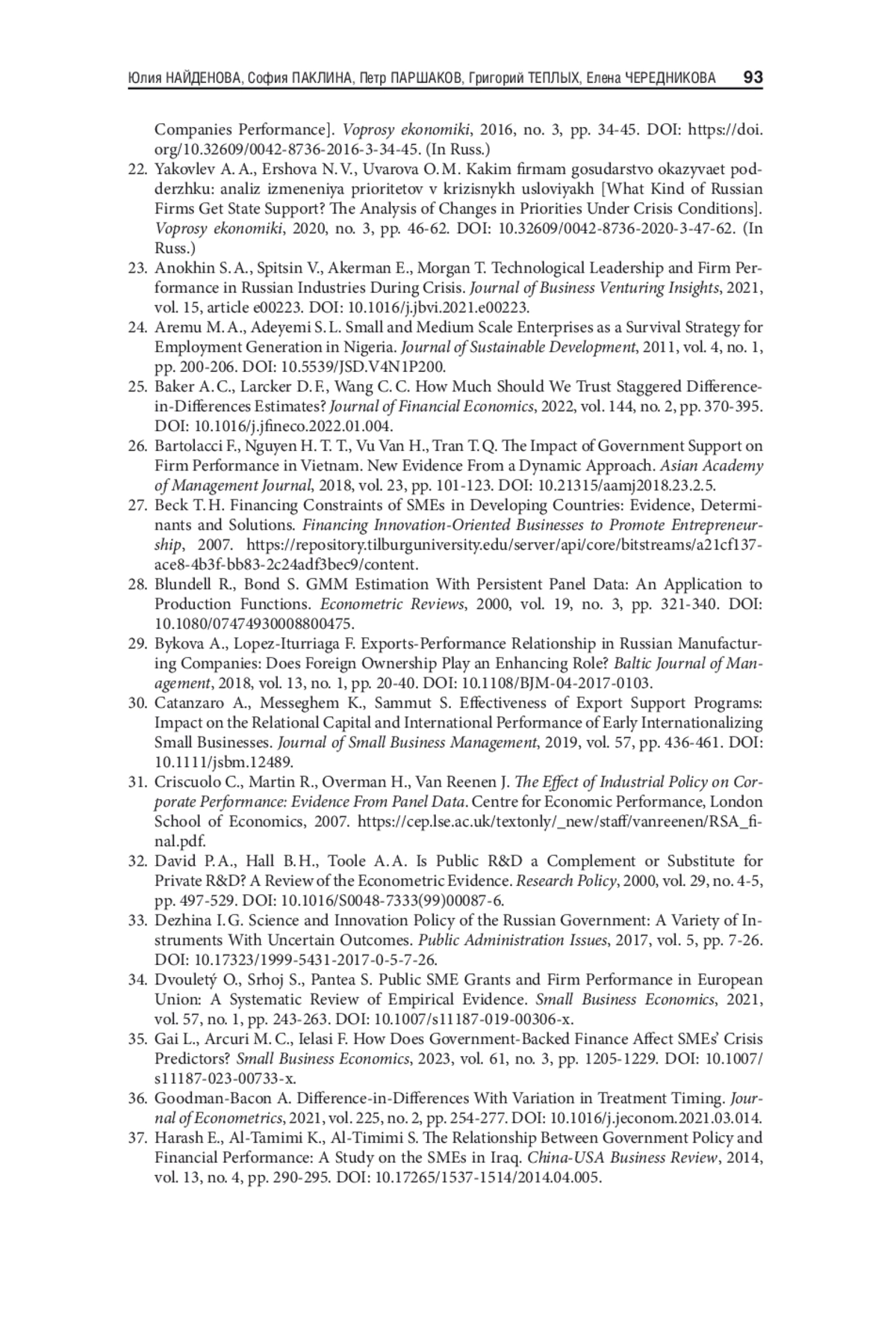 34. Dvouletý O., Srhoj S., Pantea S. Public SME Grants and Firm Performance in European Union: A Systematic Review of Empirical Evidence // Small Business Economics. 2021. Vol. 57. No 1. P. 243-263. https://doi.org/10.1007/s11187-019-00306-x.