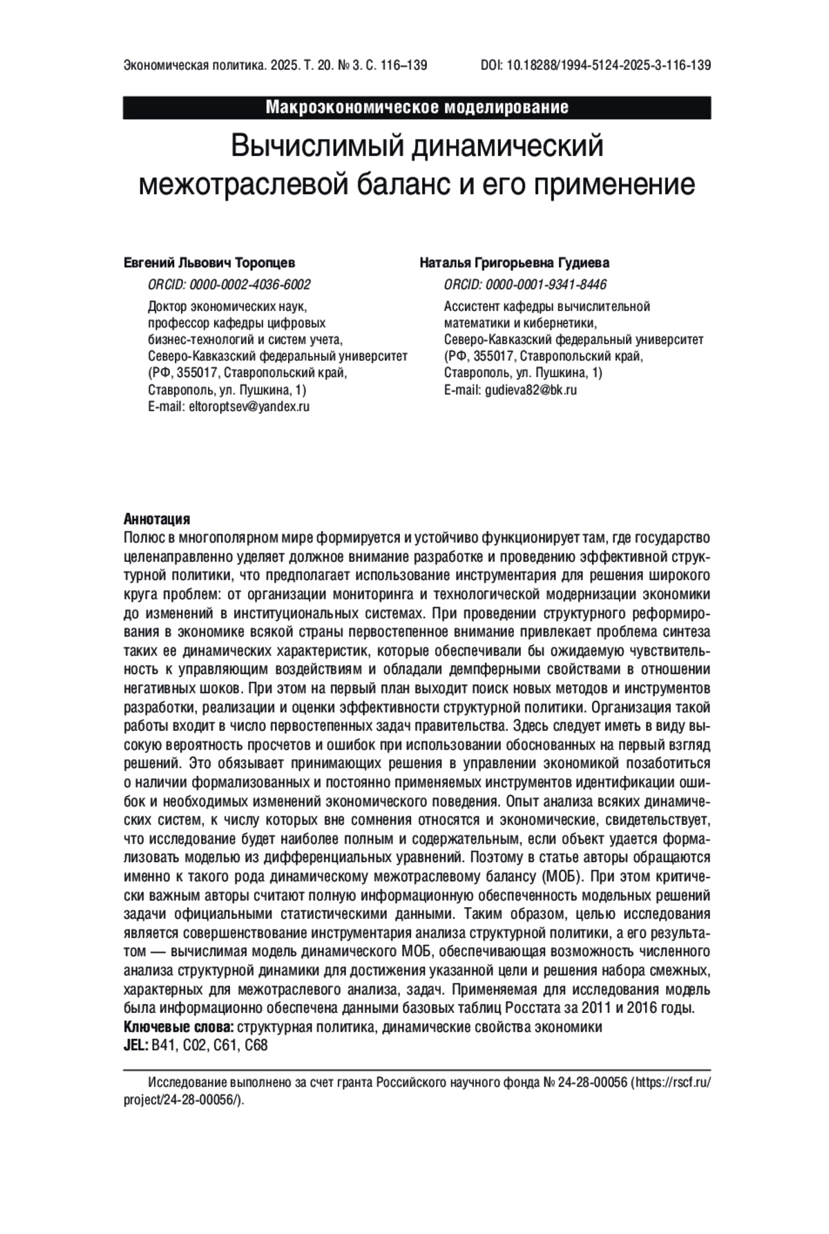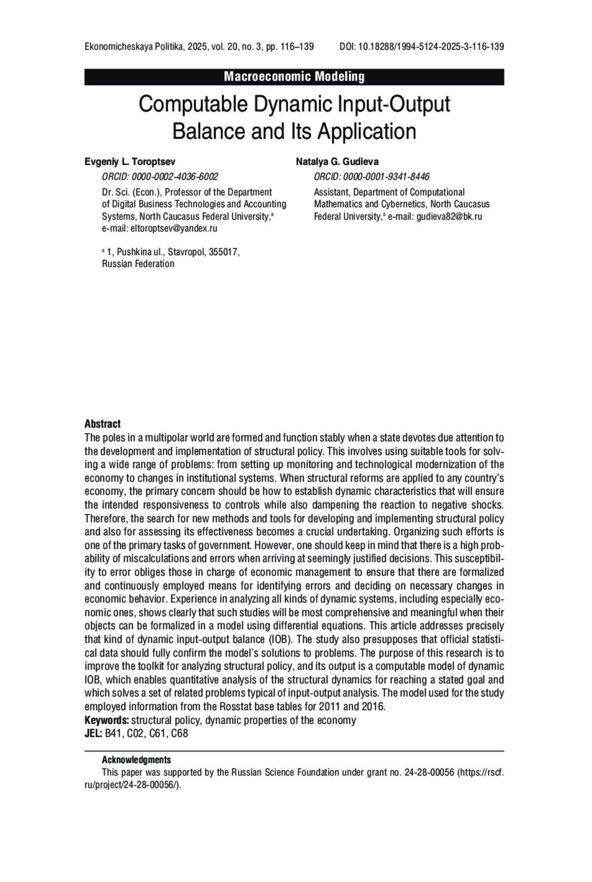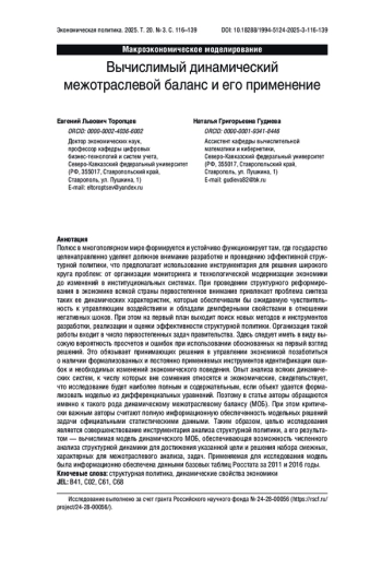 21. Торопцев Е. Л., Кандохова М. М., Гудиева Н. Г. Динамический межотраслевой баланс как инструмент анализа структурной политики // Экономика и математические методы. 2024. Т. 60. № 3. С. 43-53. https://doi.org/10.31857/S0424738824030049.