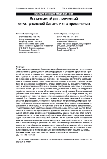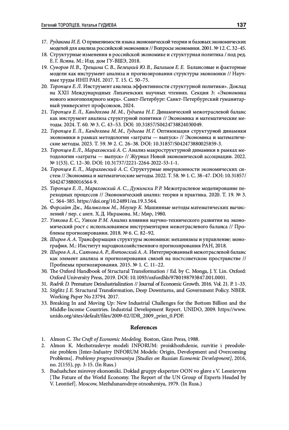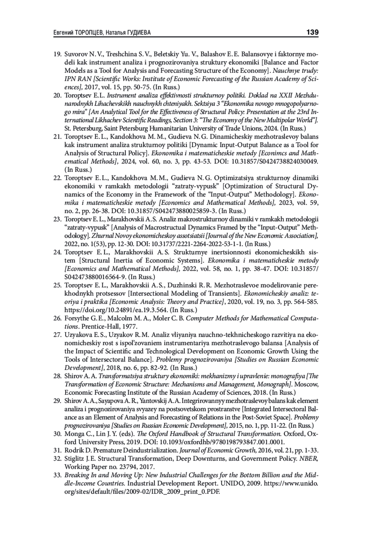 23. Торопцев Е. Л., Мараховский А. С. Анализ макроструктурной динамики в рамках методологии «затраты - выпуск» // Журнал Новой экономической ассоциации. 2022. № 1(53). С. 12-30. https://doi.org/10.31737/2221-2264-2022-53-1-1.
