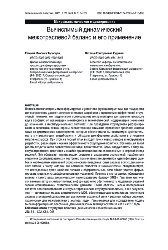 Полюс в многополярном мире формируется и устойчиво функционирует там, где государство целенаправленно уделяет должное внимание разработке и проведению эффективной структурной политики, что предполагает использование инструментария для решения широкого круга проблем: от организации мониторинга и технологической модернизации экономики до изменений в институциональных системах. При проведении структурного реформирования в экономике всякой страны первостепенное внимание привлекает проблема синтеза таких ее динамических характеристик, которые обеспечивали бы ожидаемую чувствительность к управляющим воздействиям и обладали демпферными свойствами в отношении негативных шоков. При этом на первый план выходит поиск новых методов и инструментов разработки, реализации и оценки эффективности структурной политики. Организация такой работы входит в число первостепенных задач правительства. Здесь следует иметь в виду высокую вероятность просчетов и ошибок при использовании обоснованных на первый взгляд решений. Это обязывает принимающих решения в управлении экономикой позаботиться о наличии формализованных и постоянно применяемых инструментов идентификации ошибок и необходимых изменений экономического поведения. Опыт анализа всяких динамических систем, к числу которых вне сомнения относятся и экономические, свидетельствует, что исследование будет наиболее полным и содержательным, если объект удается формализовать моделью из дифференциальных уравнений. Поэтому в статье авторы обращаются именно к такого рода динамическому межотраслевому балансу (МОБ). При этом критически важным авторы считают полную информационную обеспеченность модельных решений задачи официальными статистическими данными. Таким образом, целью исследования является совершенствование инструментария анализа структурной политики, а его результатом — вычислимая модель динамического МОБ, обеспечивающая возможность численного анализа структурной динамики для достижения указанной цели и решения набора смежных, характерных для межотраслевого анализа, задач. Применяемая для исследования модель была информационно обеспечена данными базовых таблиц Росстата за 2011 и 2016 годы.