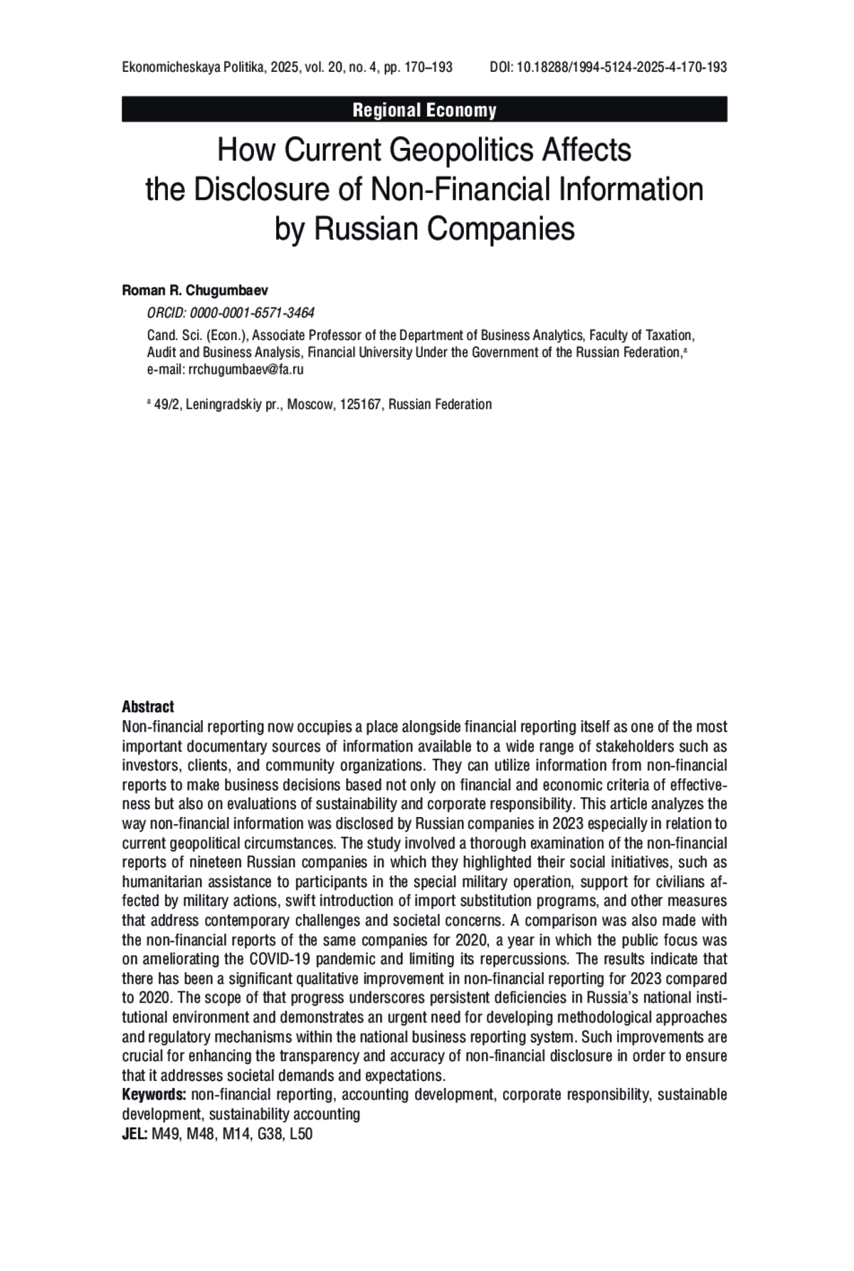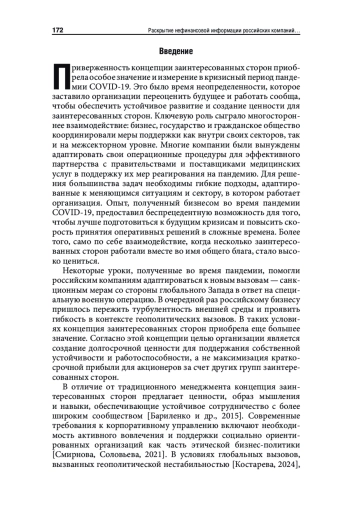 Нефинансовая отчетность наряду с финансовой в современном мире становится одним из важнейших документально подтвержденных источников информации для широкого круга заинтересованных сторон. Используя данные нефинансовой отчетности, заинтересованные стороны, включая инвесторов, клиентов и общественные организации, могут принимать деловые решения, основанные не только на финансово-экономических критериях эффективности, но и на принципах устойчивости и высокой ответственности бизнеса. Настоящая статья направлена на анализ практики раскрытия нефинансовой информации российскими компаниями в 2023 году с особым акцентом на актуальные геополитические обстоятельства. В рамках исследования было проведено тщательное изучение нефинансовых отчетов девятнадцати российских компаний. В отчетах особое внимание уделено социальным инициативам, таким как гуманитарная помощь участникам специальной военной операции, гражданам, пострадавшим от военных действий, своевременная инициация программы импортозамещения и другие меры, отвечающие на вызовы современности и особо востребованные в обществе. Для полноты анализа также рассматриваются нефинансовые отчеты этих же компаний за 2020 год, когда общественное внимание было сосредоточено на противодействии пандемии COVID-19 и ее последствиям. Результаты исследования говорят о том, что качество нефинансовой отчетности в 2020 году было значительно выше, чем в 2023-м. Это свидетельствует о недостатках именно в российской институциональной среде, в отличие от отлаженных международных практик, и демонстрирует настоятельную необходимость развития методологических подходов и регуляторных механизмов в национальной системе деловой отчетности. Подобные улучшения играют решающую роль в повышении прозрачности и точности раскрытия нефинансовой информации, обеспечивая ее соответствие требованиям и ожиданиям общества.