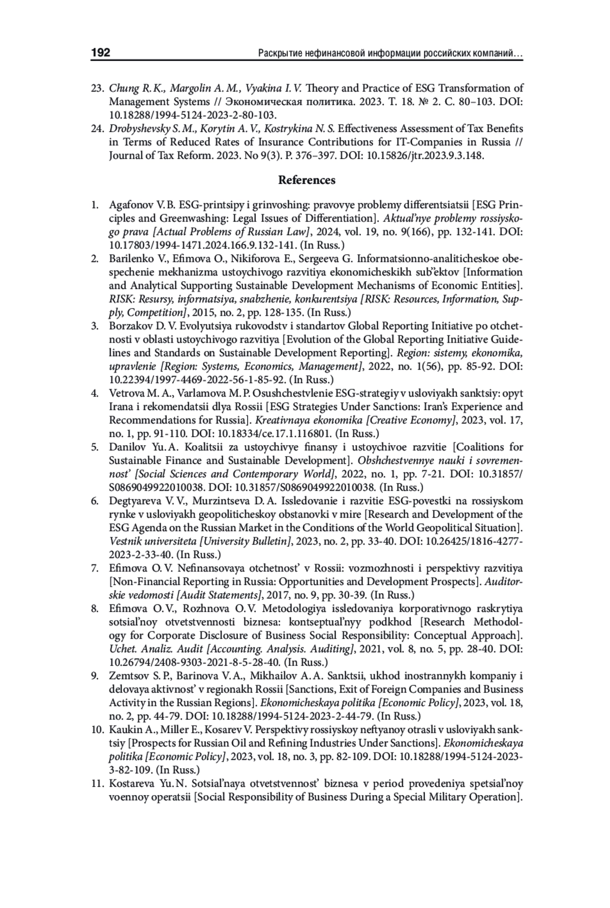 23. Chung R. K., Margolin A. M., Vyakina I. V. Theory and Practice of ESG Transformation of Management Systems // Экономическая политика. 2023. Т. 18. № 2. С. 80-103. https://doi.org/10.18288/1994-5124-2023-2-80-103.