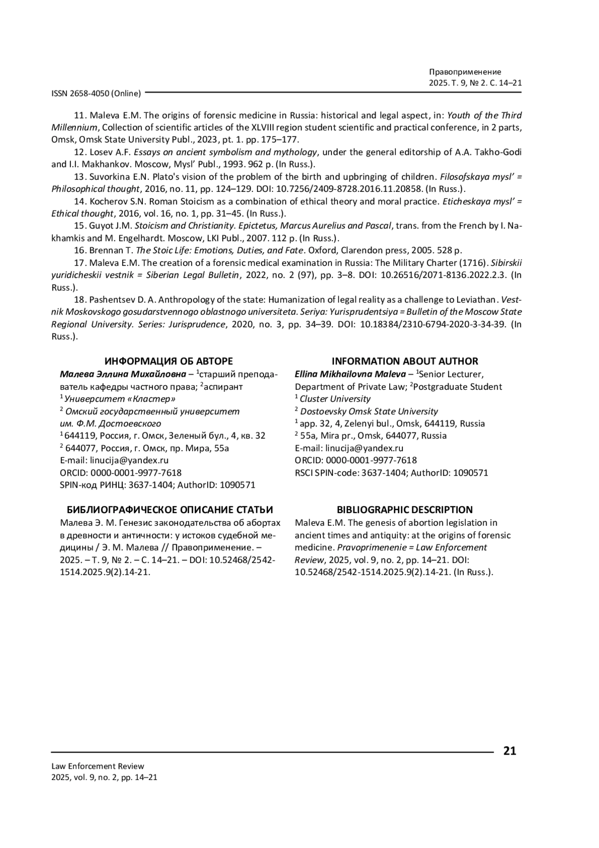 11. Малева Е.М. Истоки судебной медицины в России: историко-правовой аспект / Е.М. Малева // Молодёжь третьего тысячелетия: сб. науч. ст. XLVII регион. студент. науч.-практ. конф.: в 2 ч. - Омск: Изд-во Ом. гос. ун-та, 2023. - Ч. 1. - С. 175-177.