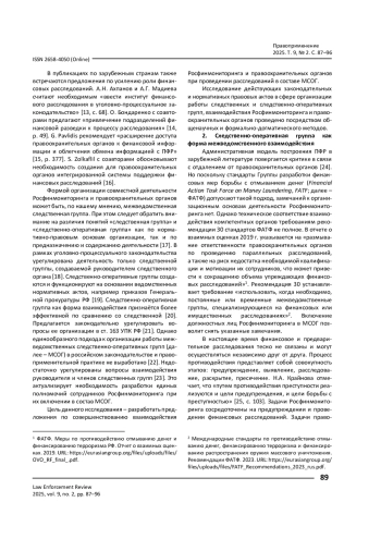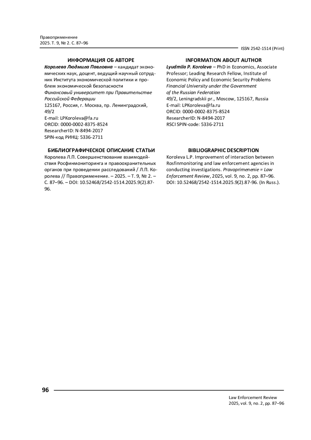 11. Кузовлева Н. Ф. Совершенствование механизма взаимодействия Росфинмониторинга с правоохранительными органами и контролирующими организациями / Н. Ф. Кузовлева, М. И. Митюкова, А. А. Костина // Представительная власть - XXI век: законодательство, комментарии, проблемы. - 2020. - № 5-6 (180-181). - С. 26-31. EDN: DNSXRO