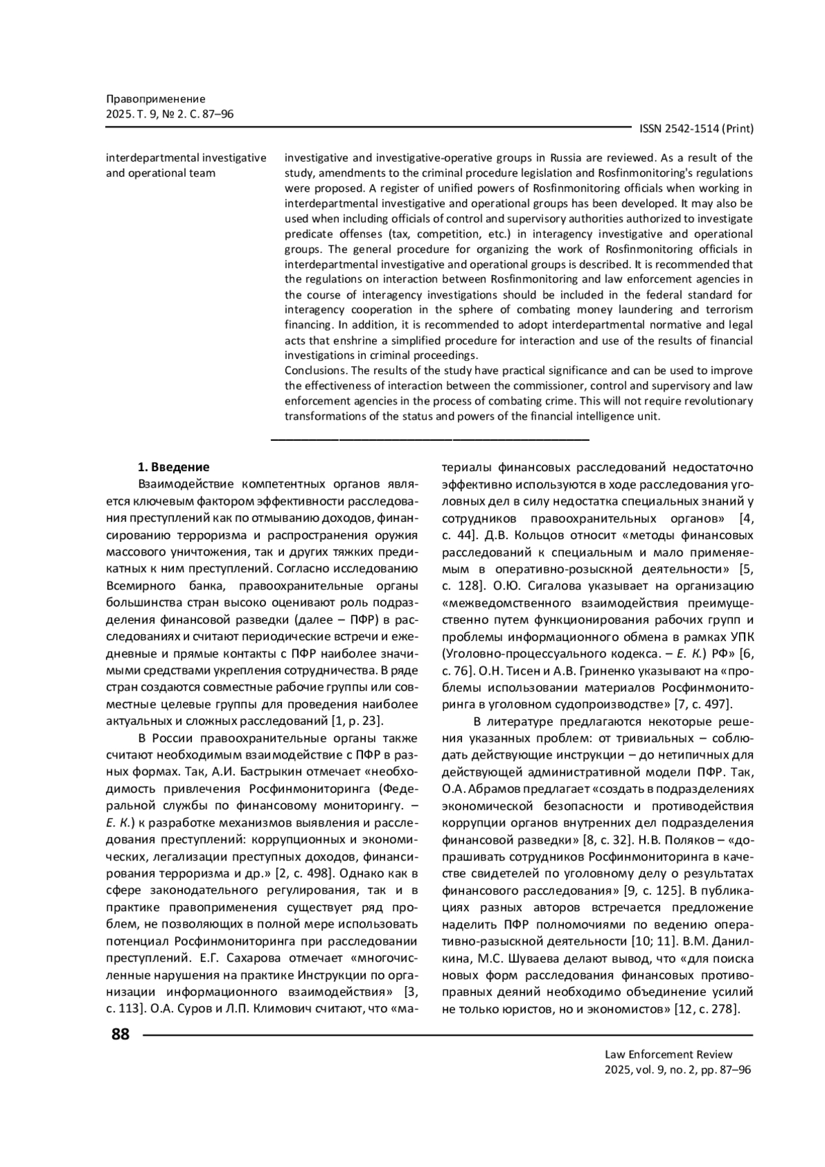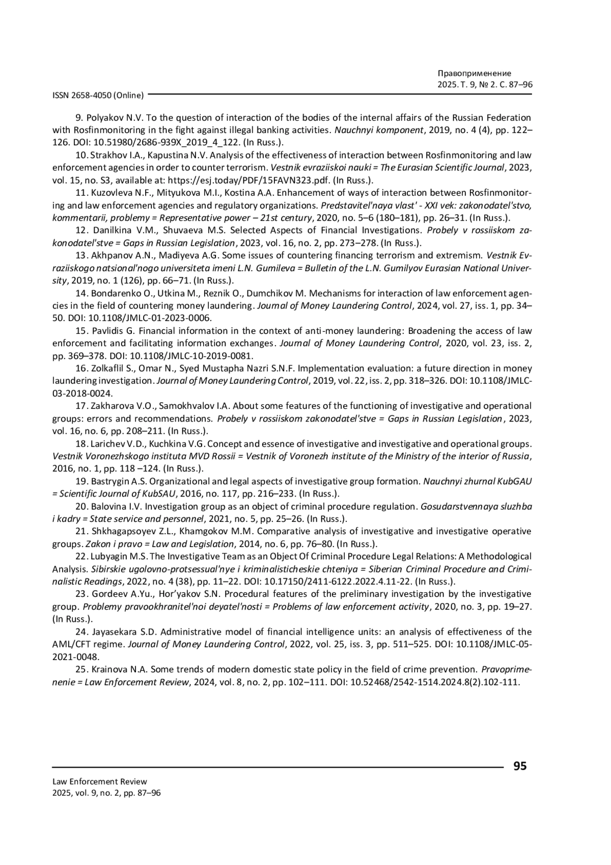 10. Страхов И. А. Анализ эффективности взаимодействия Росфинмониторинга и правоохранительных органов в целях противодействия терроризму / И. А. Страхов, Н. В. Капустина // Вестник евразийской науки. - 2023. - Т. 15, № S3. - URL: https://esj.today/PDF/15FAVN323.pdf. EDN: LRCXLO