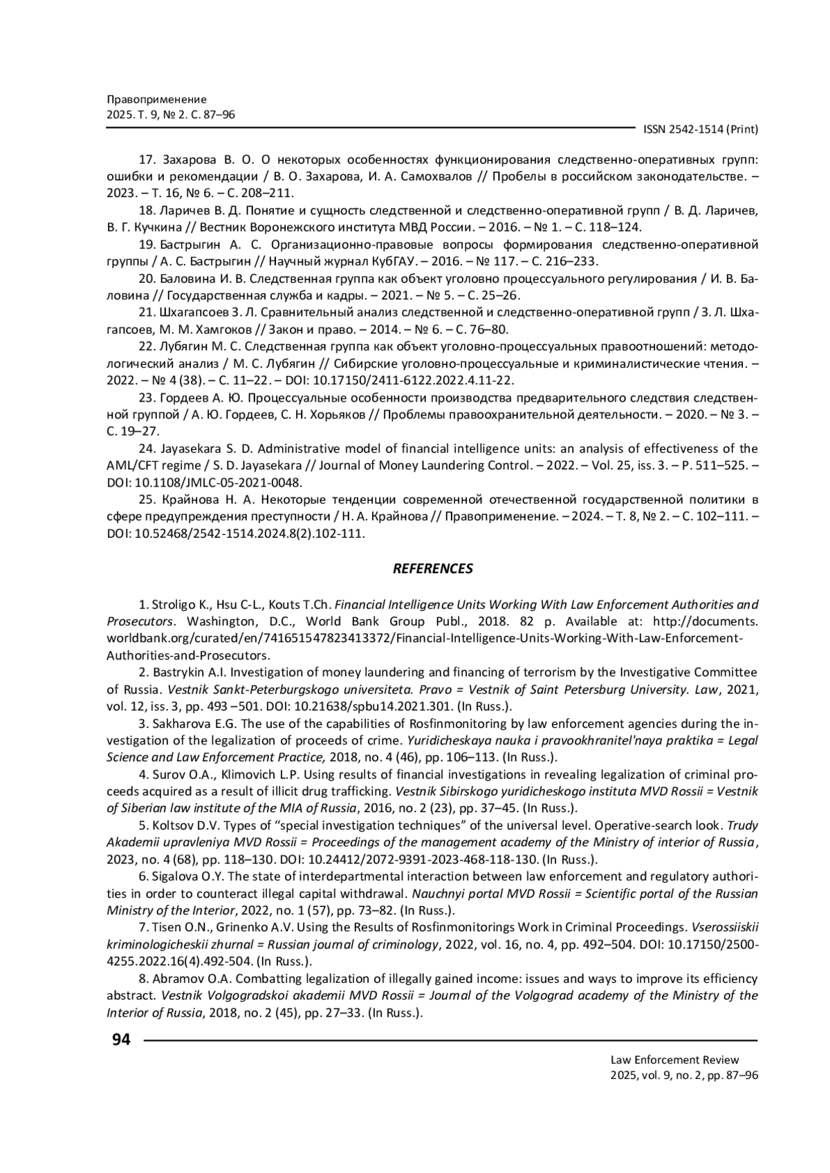 2. Бастрыкин А. И. Расследование легализации доходов, полученных преступным путем, и финансирования терроризма: практика следственного комитета России / А. И. Бастрыкин // Вестник Санкт-Петербургского университета. Право. - 2021. - Т. 12, вып. 3. - С. 493-501. -. DOI: 10.21638/spbu14.2021.301 EDN: NMBZYP