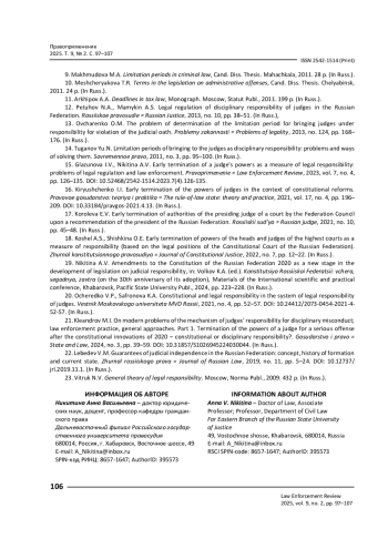 19. Никитина А. В. Поправки к Конституции РФ 2020 как новый этап развития законодательства об ответственности судей / А. В. Никитина // Конституция Российской Федерации: вчера, сегодня, завтра (к 30-летию со дня принятия): материалы междунар. науч.-практ. конф. / отв. ред. К. А. Волков. - Хабаровск: Тихоокеан. гос. ун-т, 2024. - С. 223-228. EDN: TYHMTM