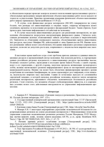 В данной статье на основании выполненных расчетов отношения инвестиций к валовому региональному продукту по данным территориальных органов Росстата в тридцати случайным образом выбранных субъектах РФ делаются выводы о состоянии соответствия полученных значений ориентиру пп. б) п.1 Указа Президента РФ от 07.05.2012 г. No 596 «О долгосрочной государственной экономической политике» в части соответствия двадцатисемипроцентному уровню увеличения объема инвестиций (к 2018 году). С учетом полученных выводов в целях обеспечения экономической безопасности российских регионов предлагается перспективный механизм реализации мегапроектов, в процессе функционирования которого возможно преодоление негативных последствий растущей инфляции на развитие критически важных сфер экономической деятельности
