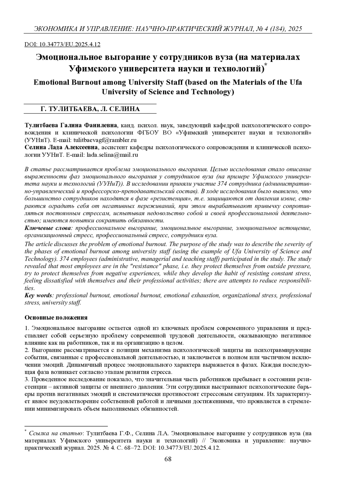 В статье рассматривается проблема эмоционального выгорания. Целью исследования стало описание выраженности фаз эмоционального выгорания у сотрудников вуза (на примере Уфимского университета науки и технологий (УУНиТ)). В исследовании приняли участие 374 сотрудника (административно-управленческий и профессорско-преподавательский состав). В ходе исследования было выявлено, что большинство сотрудников находятся в фазе «резистенция», т. е. защищаются от давления извне, стараются оградить себя от негативных переживаний, при этом вырабатывают привычку сопротивляться постоянным стрессам, испытывая недовольство собой и своей профессиональной деятельностью; имеются попытки сократить обязанности.