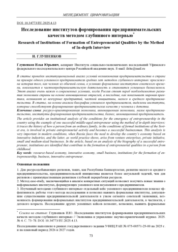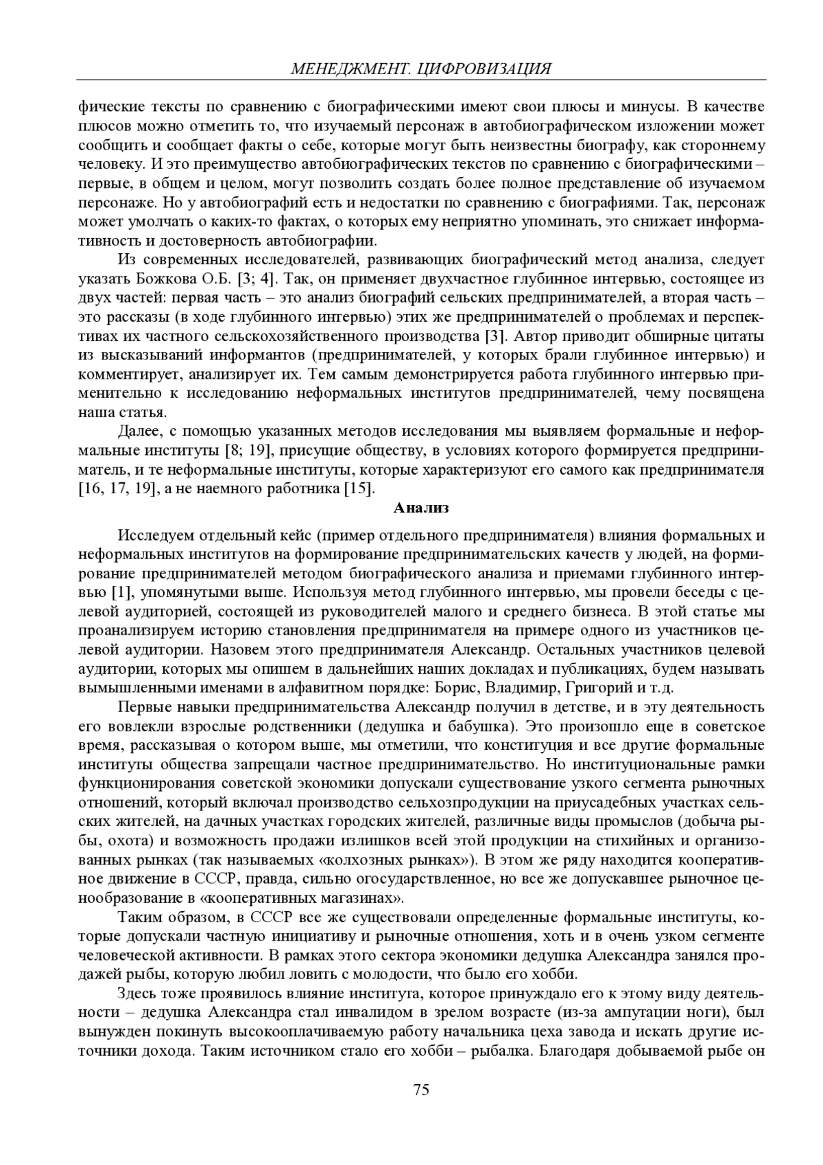 В статье проведен институциональный анализ условий возникновения предпринимательства в стране на примере одного успешного предпринимателя средних лет методом глубинного интервью: прослежена история того, как человек из обычной семьи, в условиях формальных институтов советского времени, вовлекается в частнопредпринимательскую деятельность и становится успешным бизнесменом. Этот анализ очень важен в современных условиях, когда Россия стоит перед необходимостью развития экономики страны на основе инновационных отраслей, а последние, как показывает мировая практика, возникают из венчурных предприятий, частной инициативы, малого и среднего предпринимательства. В статье, на основе анализа биографии успешного предпринимателя, выделены институты, которые способствуют формированию предпринимательских качеств у человека с детства