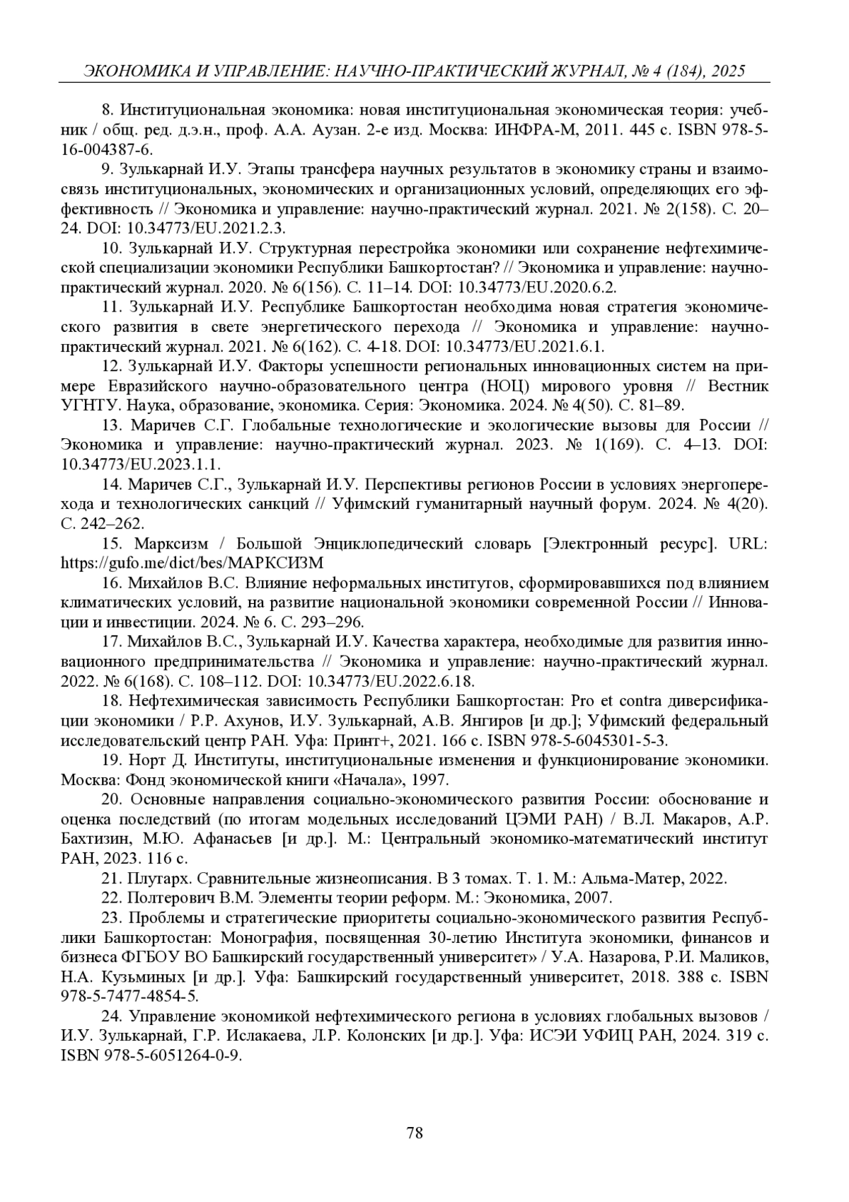 24. Управление экономикой нефтехимического региона в условиях глобальных вызовов / И.У. Зулькарнай, Г.Р. Ислакаева, Л.Р. Колонских [и др.]. Уфа: ИСЭИ УФИЦ РАН, 2024. 319 с. 978-5-6051264-0-9. ISBN: 978-5-605-12640-9 EDN: OYAWPP