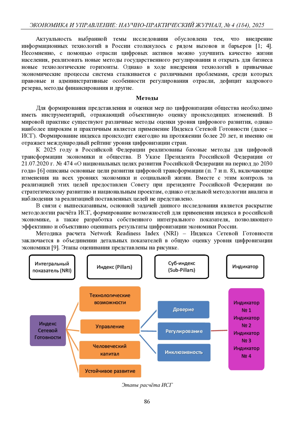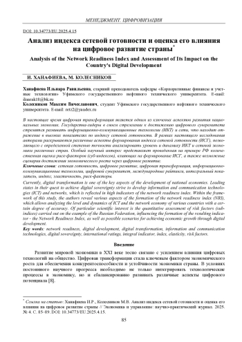 В настоящее время цифровая трансформация является одним из ключевых аспектов развития национальных экономик. Государства-лидеры в своем стремлении к достижению цифрового суверенитета стремятся развивать информационно-коммуникационные технологии (ИКТ) и сети, что находит отражение в высоких показателях по индексу сетевой готовности. В рамках настоящего исследования авторами раскрываются различные аспекты формирования индекса сетевой готовности (ИСГ), позволяющего с определенной степенью точности анализировать уровень и динамику ИКТ и сетевой экономики различных стран. Особый научный интерес представляет проведенная на примере РФ количественная оценка риск-факторов (суб-индексов), влияющих на формирование ИСГ, а также возможные сценарии достижения экономического роста через цифровое развитие