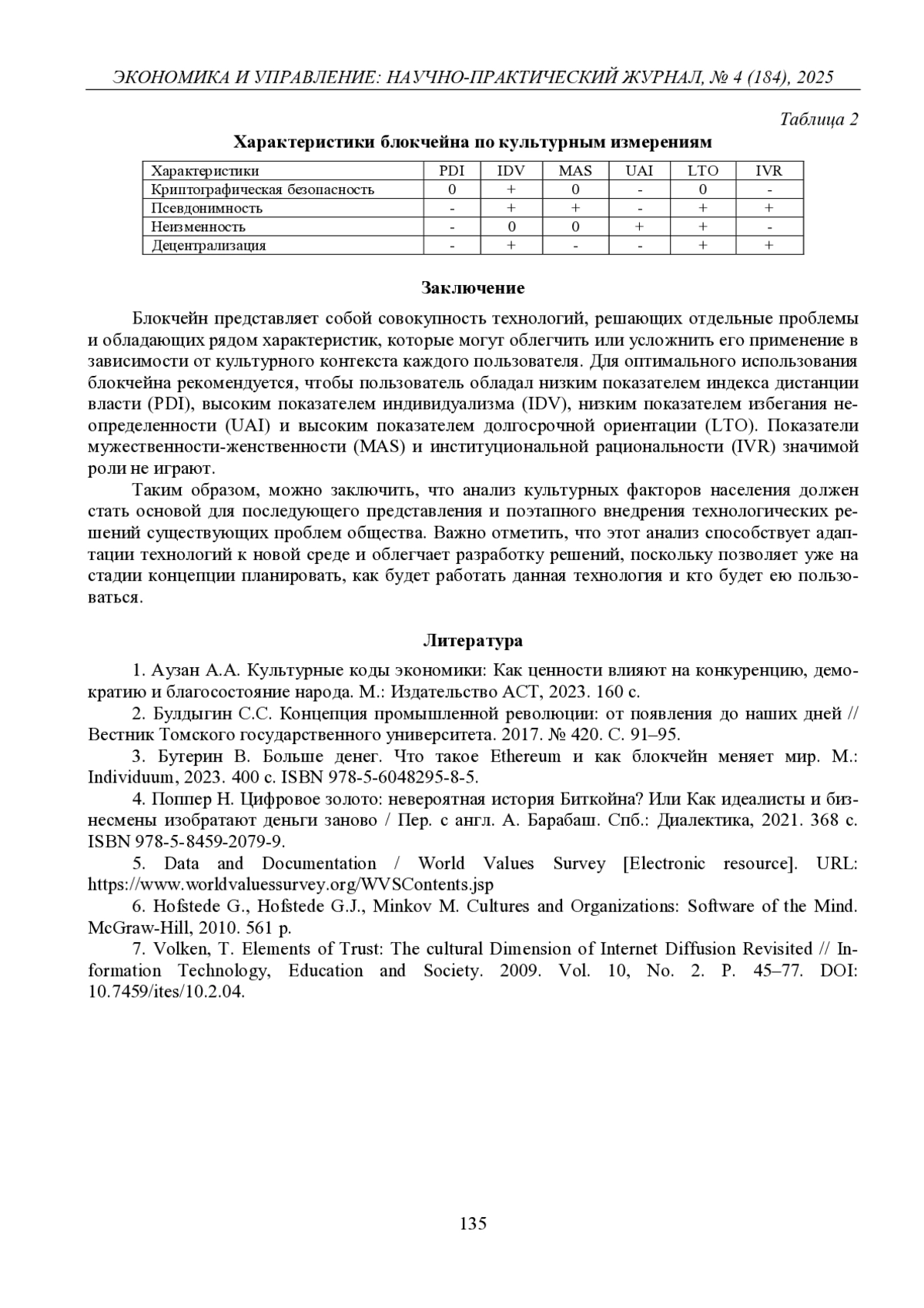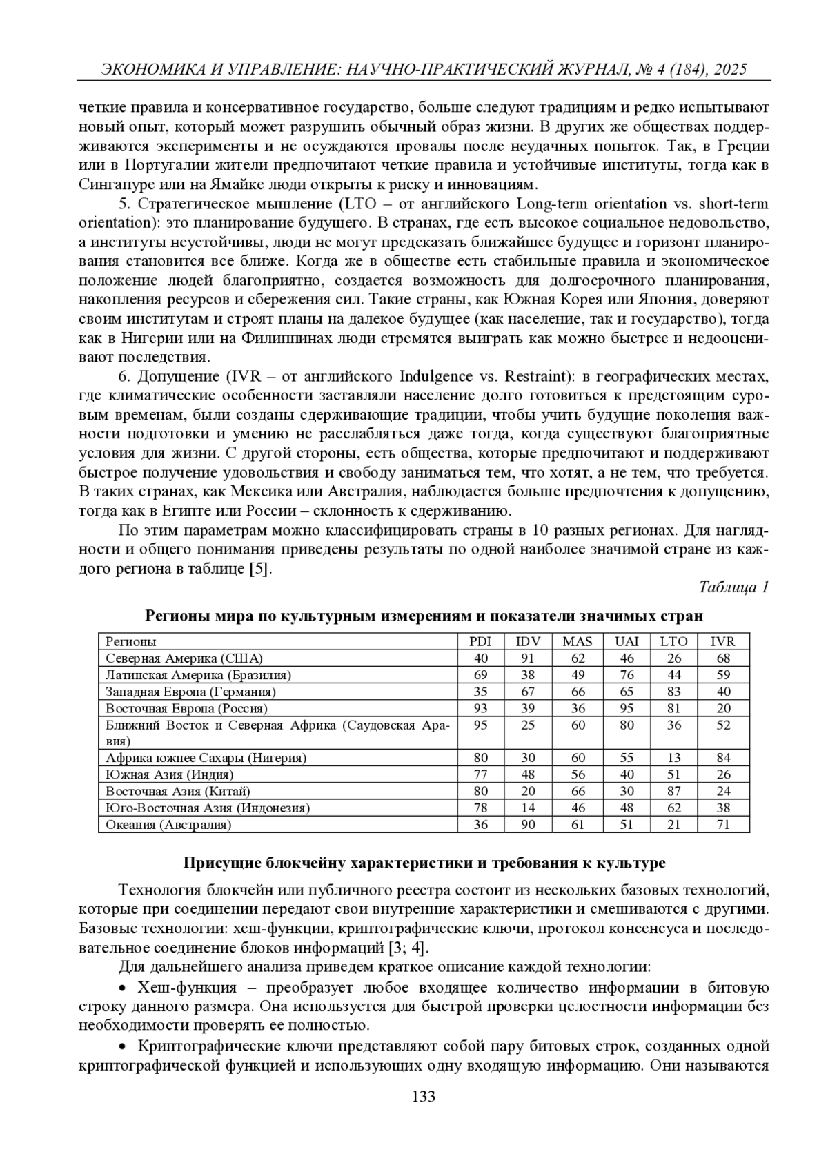 В статье рассматриваются культурные измерения Хофстеде и Минкова, подробно раскрываются ключевые аспекты каждого из измерений, проводится исследование технологии блокчейн через призму культурных особенностей. Анализируются технологические компоненты, способствующие формированию блокчейн-инфраструктуры, а также выявляются уникальные характеристики каждой составляющей, требующие специфического культурного контекста для эффективного внедрения и эксплуатации.