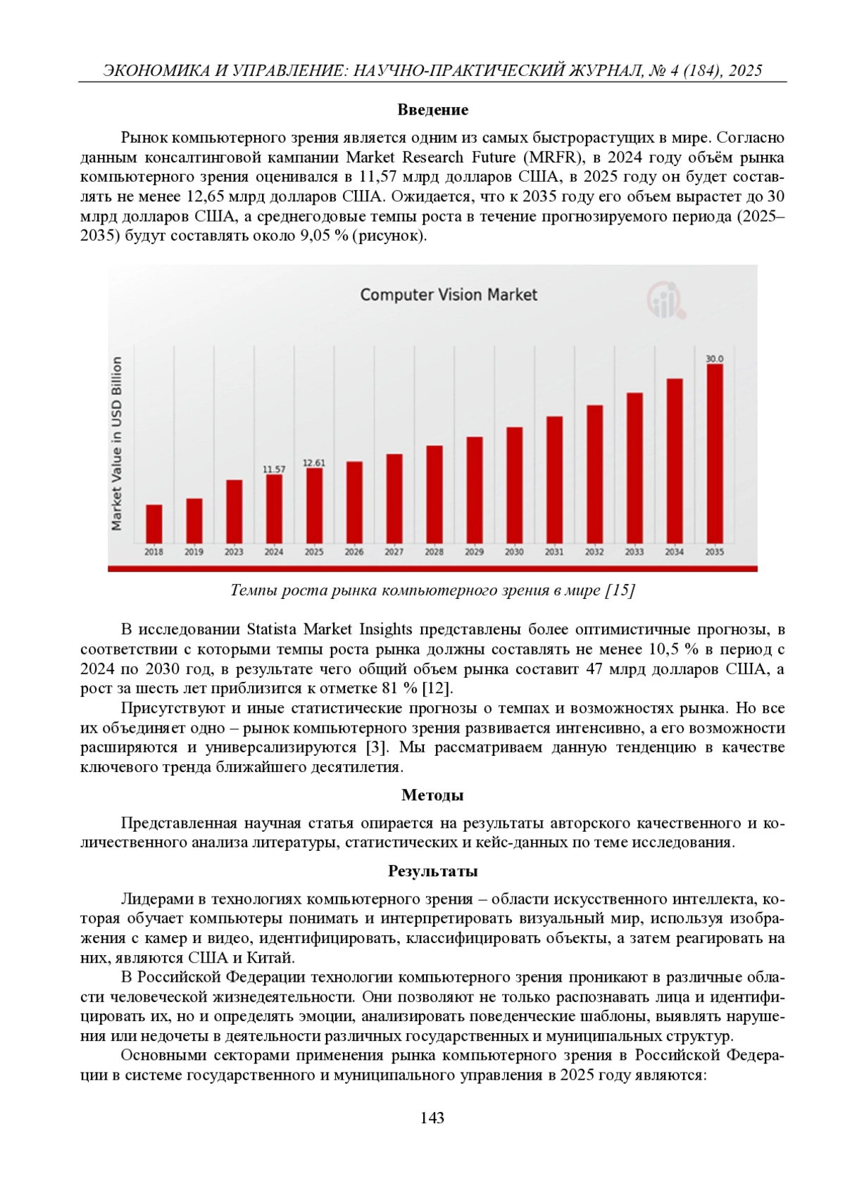 Рынок компьютерного зрения является одним из самых быстрорастущих в мире. Согласно данным консалтинговой кампании Market Research Future (MRFR), в 2024 году объём рынка компьютерного зрения оценивался в 11,57 млрд долларов США, в 2025 году он будет составлять не менее 12,65 млрд долларов США. Ожидается, что к 2035 году его объем вырастет до 30 млрд долларов США, а среднегодовые темпы роста в течение прогнозируемого периода (2025– 2035) будут составлять около 9,05 % (рисунок). Темпы роста рынка компьютерного зрения в мире [15] В исследовании Statista Market Insights представлены более оптимистичные прогнозы, в соответствии с которыми темпы роста рынка должны составлять не менее 10,5 % в период с 2024 по 2030 год, в результате чего общий объем рынка составит 47 млрд долларов США, а рост за шесть лет приблизится к отметке 81 % [12]. Присутствуют и иные статистические прогнозы о темпах и возможностях рынка. Но все их объединяет одно – рынок компьютерного зрения развивается интенсивно, а его возможности расширяются и универсализируются [3]. Мы рассматриваем данную тенденцию в качестве ключевого тренда ближайшего десятилетия. Методы Представленная научная статья опирается на результаты авторского качественного и количественного анализа литературы, статистических и кейс-данных по теме исследования. Результаты Лидерами в технологиях компьютерного зрения – области искусственного интеллекта, которая обучает компьютеры понимать и интерпретировать визуальный мир, используя изображения с камер и видео, идентифицировать, классифицировать объекты, а затем реагировать на них, являются США и Китай. В Российской Федерации технологии компьютерного зрения проникают в различные области человеческой жизнедеятельности. Они позволяют не только распознавать лица и идентифицировать их, но и определять эмоции, анализировать поведенческие шаблоны, выявлять нарушения или недочеты в деятельности различных государственных и муниципальных структур. Основными секторами применения рынка компьютерного зрения в Российской Федерации в системе государственного и муниципального управления в 2025 году являются: