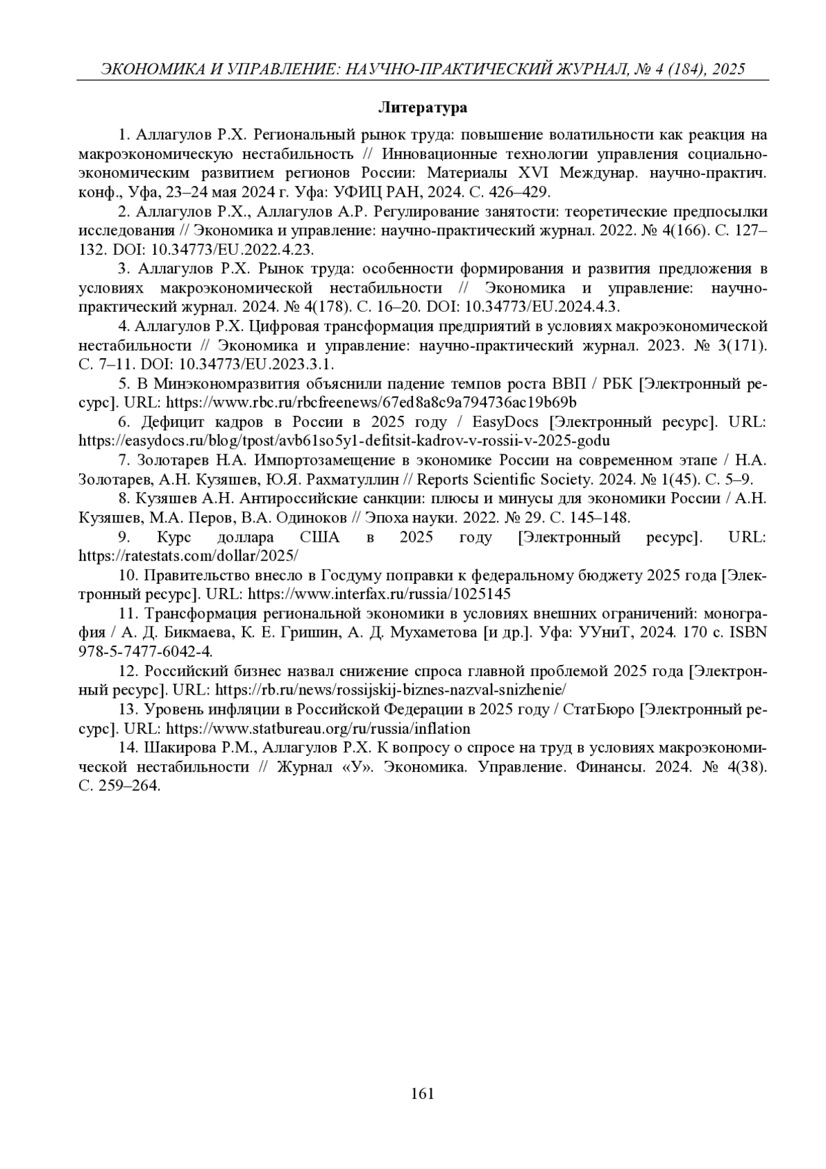 3. Аллагулов Р.Х. Рынок труда: особенности формирования и развития предложения в условиях макроэкономической нестабильности // Экономика и управление: научно-практический журнал. 2024. № 4(178). С. 16-20. DOI: 10.34773/EU.2024.4.3