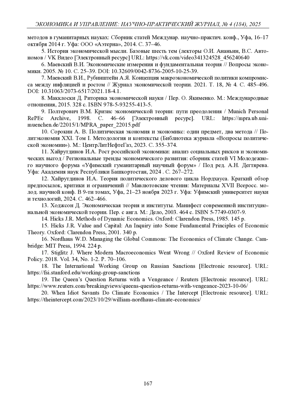 7. 	Маевский В.И., Рубинштейн А.Я. Концепция макроэкономической политики компромисса между инфляцией и ростом // Журнал экономической теории. 2021. Т. 18, № 4. С. 485-496.  DOI: 10.31063/2073-6517/2021.18-4.1  EDN: FNDDFJ