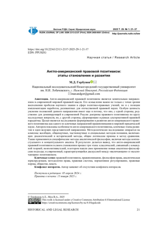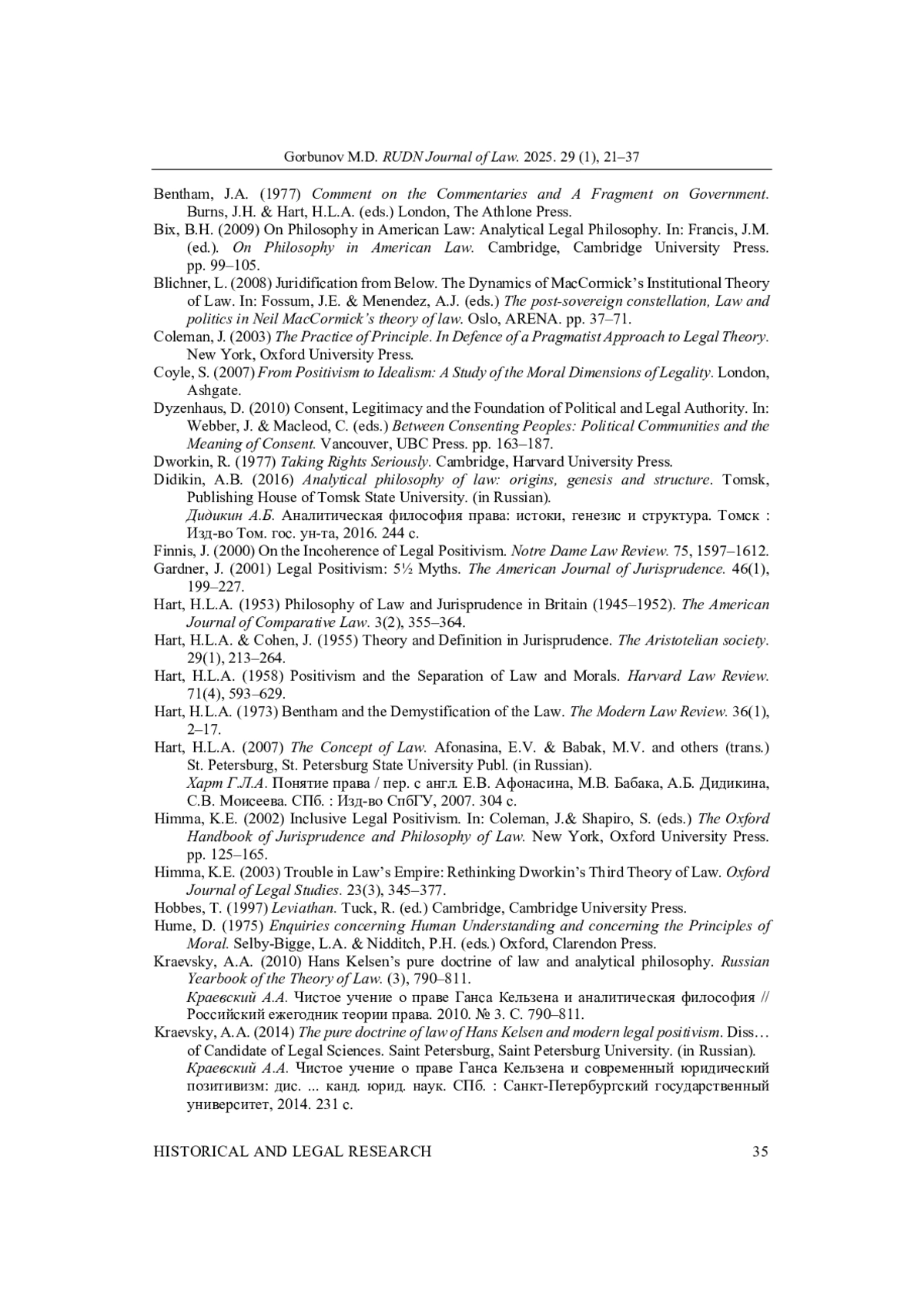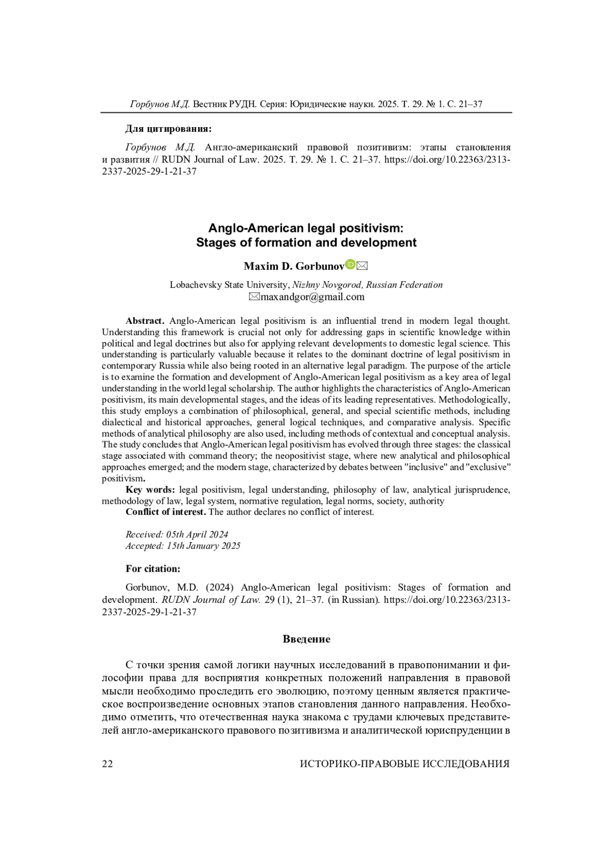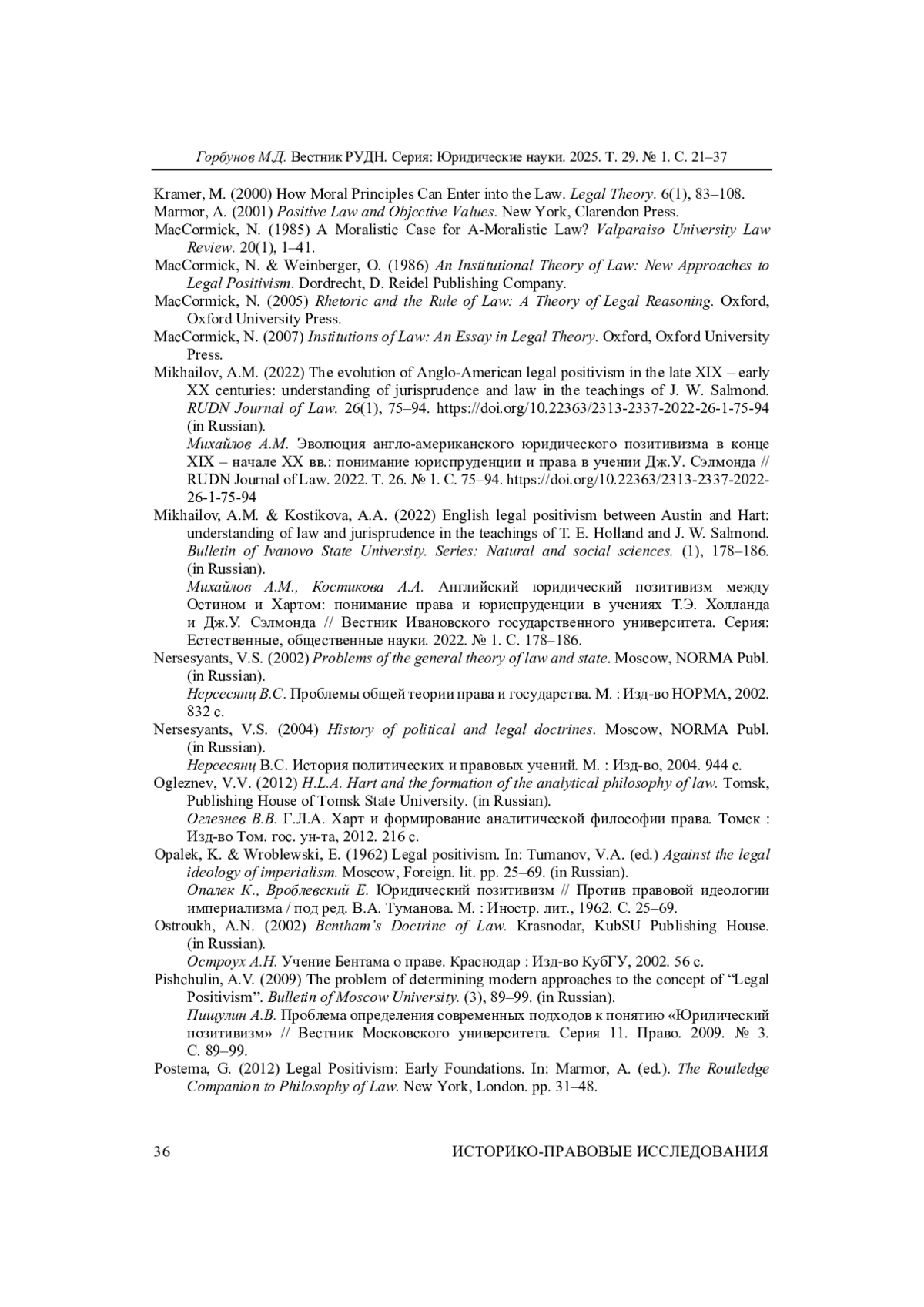 33. Михайлов А.М. Эволюция англо-американского юридического позитивизма в конце XIX - начале XX вв.: понимание юриспруденции и права в учении Дж.У. Сэлмонда // RUDN Journal of Law. 2022. Т. 26. № 1. С. 75-94. DOI: 10.22363/2313-2337-2022-26-1-75-94 EDN: XFUVSG