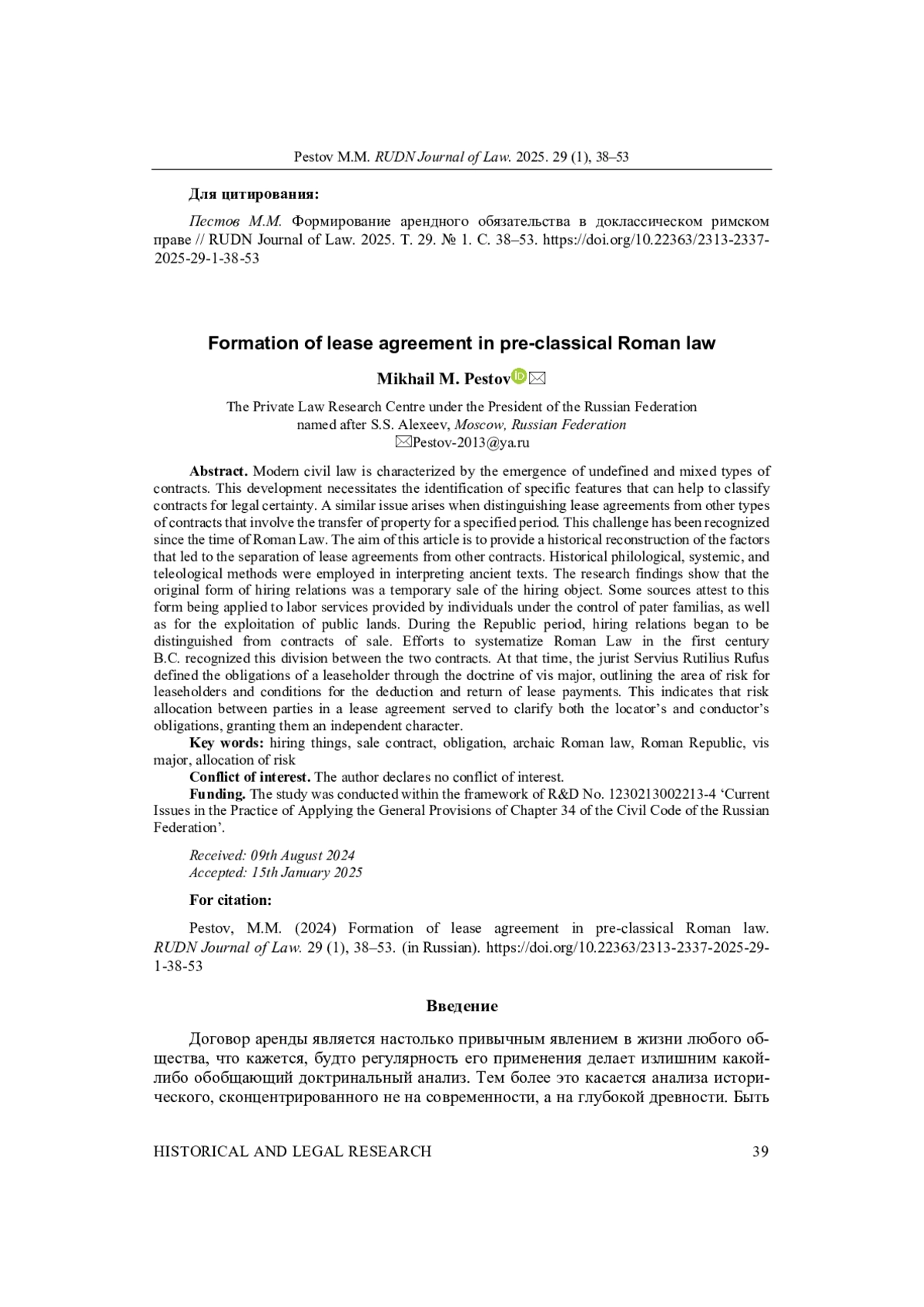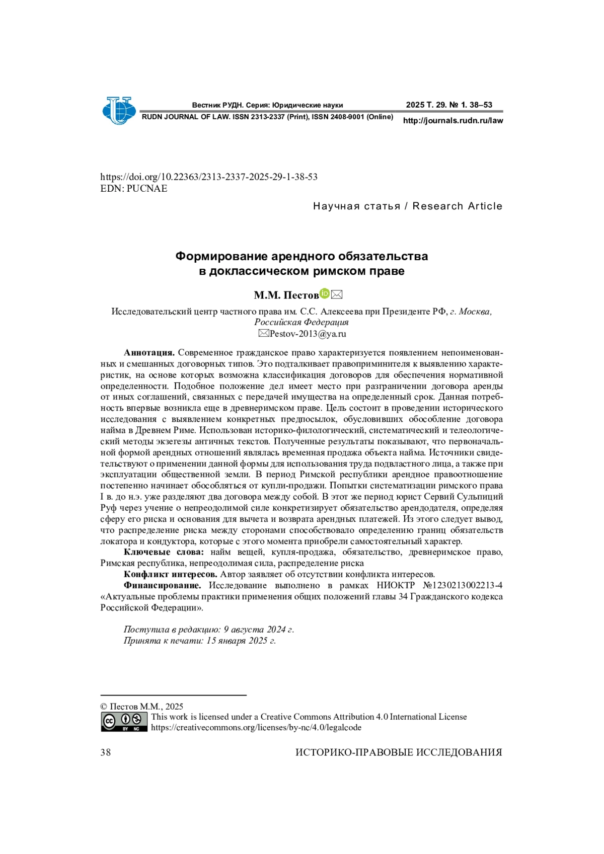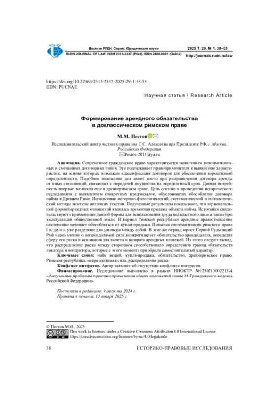Современное гражданское право характеризуется появлением непоименованных и смешанных договорных типов. Это подталкивает правоприминителя к выявлению характеристик, на основе которых возможна классификация договоров для обеспечения нормативной определенности. Подобное положение дел имеет место при разграничении договора аренды от иных соглашений, связанных с передачей имущества на определенный срок. Данная потребность впервые возникла еще в древнеримском праве. Цель состоит в проведении исторического исследования с выявлением конкретных предпосылок, обусловивших обособление договора найма в Древнем Риме. Использован историко-филологический, систематический и телеологический методы экзегезы античных текстов. Полученные результаты показывают, что первоначальной формой арендных отношений являлась временная продажа объекта найма. Источники свидетельствуют о применении данной формы для использования труда подвластного лица, а также при эксплуатации общественной земли. В период Римской республики арендное правоотношение постепенно начинает обособляться от купли-продажи. Попытки систематизации римского права I в. до н. э. уже разделяют два договора между собой. В этот же период юрист Сервий Сульпиций Руф через учение о непреодолимой силе конкретизирует обязательство арендодателя, определяя сферу его риска и основания для вычета и возврата арендных платежей. Из этого следует вывод, что распределение риска между сторонами способствовало определению границ обязательств локатора и кондуктора, которые с этого момента приобрели самостоятельный характер.