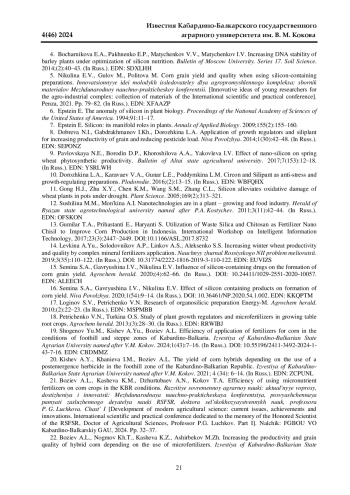 16. Семина С. А., Гаврюшина И. В., Никулина Е. В. Влияние препаратов с кремнием на формирование урожайности кукурузы // Нива Поволжья. 2020. № 1(54). С.9-14. DOI: 10.36461/NP.2020.54.1.002 EDN: KKQPTM