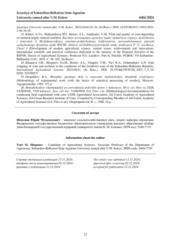 19. Шогенов Ю. М., Кишев А. Ю., Бозиев А. Л. Эффективность применения удобрений под кукурузу в условиях предгорной и степной зон Кабардино-Балкарии // Известия Кабардино-Балкарского государственного аграрного университета им. В. М. Кокова. 2024. № 1(43). С. 7-16. 10.55196/2411- 3492-2024-1-43-7-16. DOI: 10.55196/2411-3492-2024-1-43-7-16 EDN: CBDMMZ