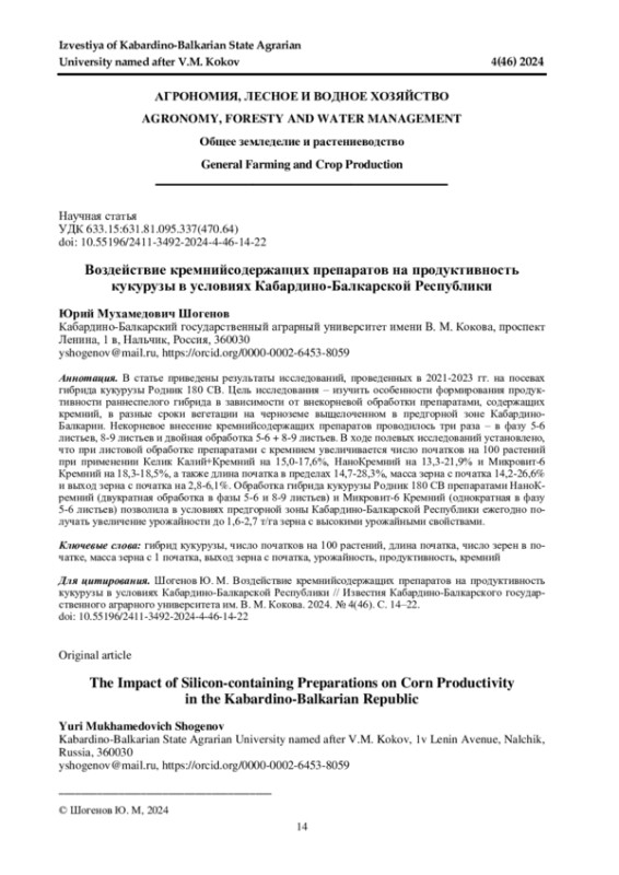 В статье приведены результаты исследований, проведенных в 2021-2023 гг. на посевах гибрида кукурузы Родник 180 СВ. Цель исследования - изучить особенности формирования продуктивности раннеспелого гибрида в зависимости от внекорневой обработки препаратами, содержащих кремний, в разные сроки вегетации на черноземе выщелоченном в предгорной зоне КабардиноБалкарии. Некорневое внесение кремнийсодержащих препаратов проводилось три раза - в фазу 5-6 листьев, 8-9 листьев и двойная обработка 5-6 + 8-9 листьев. В ходе полевых исследований установлено, что при листовой обработке препаратами с кремнием увеличивается число початков на 100 растений при применении Келик Калий+Кремний на 15,0-17,6%, НаноКремний на 13,3-21,9% и Микровит-6 Кремний на 18,3-18,5%, а также длина початка в пределах 14,7-28,3%, масса зерна с початка 14,2-26,6% и выход зерна с початка на 2,8-6,1%. Обработка гибрида кукурузы Родник 180 СВ препаратами НаноКремний (двукратная обработка в фазы 5-6 и 8-9 листьев) и Микровит-6 Кремний (однократная в фазу 5-6 листьев) позволила в условиях предгорной зоны Кабардино-Балкарской Республики ежегодно получать увеличение урожайности до 1,6-2,7 т/га зерна с высокими урожайными свойствами.