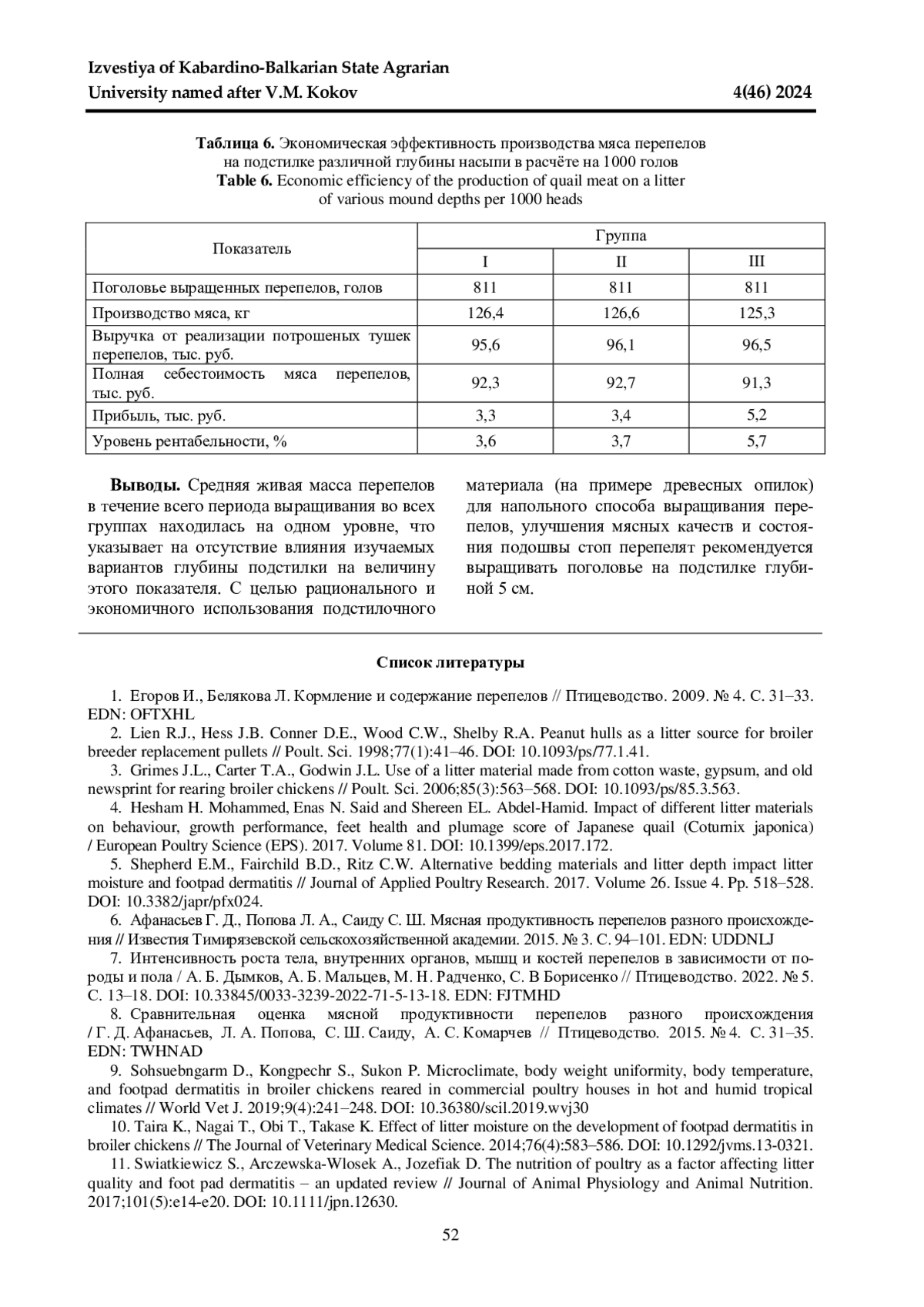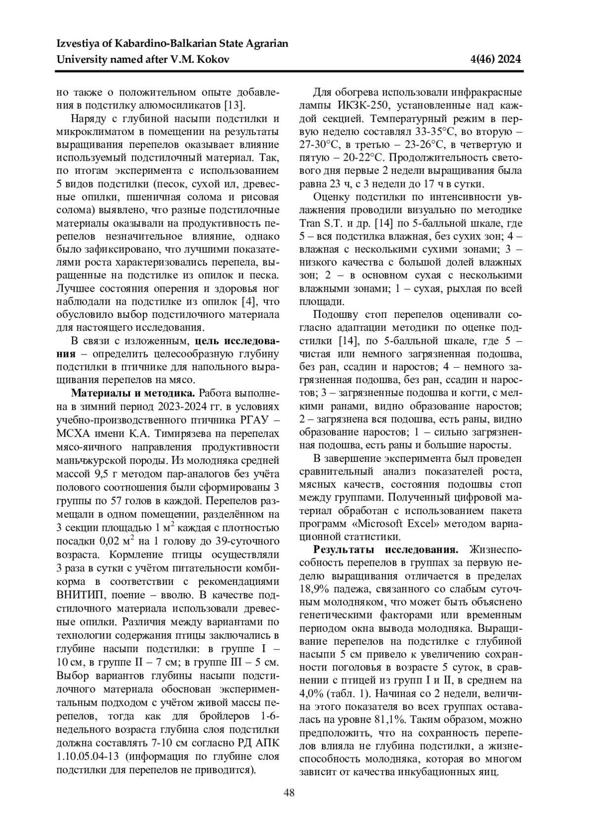 12. Ahmed M.E., Shaaban S.E., Ensaf A.El-Full., Bothaina Y.M., Hamada E. Influence of Improved Microclimate Conditions on Growth and Physiological Performance of Two Japanese Quail Lines // Animals (Basel). 2023;13(6):1118. DOI: 10.3390/ani13061118 EDN: ZVSMZS