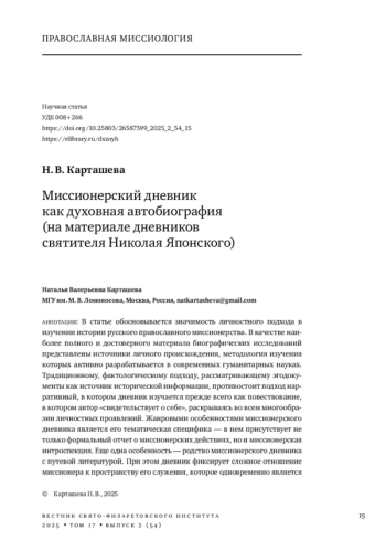 В статье обосновывается значимость личностного подхода в изу чении истории русского православного миссионерства. В качестве наиболее полного и достоверного материала биографических исследований представлены источники личного происхождения, методология изучения которых активно разрабатывается в современных гуманитарных науках. Традиционному, фактологическому подходу, рассматривающему эгодокументы как источник исторической информации, противостоит подход нарративный, в котором дневник изучается прежде всего как повествование, в котором автор «свидетельствует о себе», раскрываясь во всем многообразии личностных проявлений. Жанровыми особенностями миссионерского дневника является его тематическая специфика - в нем присутствует не только формальный отчет о миссионерских действиях, но и миссионерская интроспекция. Еще одна особенность - родство миссионерского дневника с путевой литературой. При этом дневник фиксирует сложное отношение миссионера к пространству его служения, которое одновременно является «чужим» и «своим». На примере наследия свт. Николая Японского миссионерский дневник рассматривается как особая форма духовной биографии. Своеобразие автобиографизма дневникового текста в том, что он не выстраивает единую «линию жизни», а фиксирует «переживание» отдельных ее ситуаций через «проговаривание» их в дневнике. Таким образом, процесс нарративации не только фиксирует индивидуальный опыт, но и является средством его осмысления, освоения, соотнесения с культурным контекстом своего жизненного мира. Анализ дневниковых записей позволил выявить такие стороны личности святителя, как напряженная эмоциональность, широта мировосприятия, искренность, исповедальность, постоянное молитвенное делание, верность поставленной цели и цельность. Обозначенные в статье подходы к изучению миссионерских дневников могут послужить основой для расширения исследовательского поля в сфере русской православной миссии, а анализ миссионерской рефлексии в дневниках выдающихся деятелей русской православной миссии прошлого имеет большую ценность для развития теоретических и практических аспектов современной миссии.