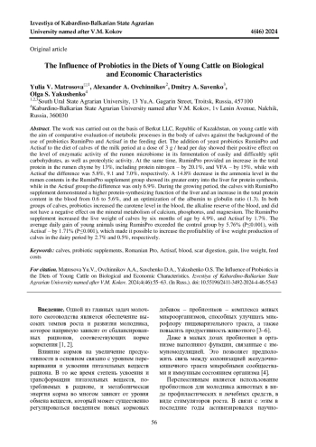 Работа выполнена на базе ТОО «Беркут» Республики Казахстан на молодняке крупного рогатого скота с целью сравнительной оценки обменных процессов в организме телят на фоне применения в рационе кормления пробиотиков РуминПро и Актисаф. Добавка дрожжевых пробиотиков РуминПро и Актисаф в рационе телят молочного периода в дозе 3 г/гол. в сутки показало их положительное влияние на уровень ферментативной активности микробиома рубца в его ферментации легко и трудно расщепляемых углеводов, а также протеолитической активности. При этом РуминПро обеспечил повышение в химусе рубца общего белка на 13%, в том числе белкового азота - на 20,1%, а ЛЖК - на 15%, в то время как с Актисафом различие составило 5,8%, 9,1 и 7,0% соответственно. Снижение уровня аммиака в содержимом рубца в группе с добавкой РуминПро на 14,8% показало его большее поступление в печень для синтеза белка, в группе с Актисаф - различие составило только 6,9%. За период выращивания в организме телят с добавкой РуминПро отмечена более высокая белковосинтезирующуя функция печени и повышение содержания общего белка в крови от 0,6 до 5,6%, оптимизация отношения альбумина к глобулину (1,3). Пробиотики в обеих группах телят повысили щелочной резерв крови, уровень каротина в крови и не оказали отрицательного влияния на минеральный обмен кальция, фосфора и магния. Добавка РуминПро увеличила живую массу телят к шестимесячному возрасту на 4,9%, Актисаф - на 1,7%. Среднесуточный прирост молодняка с использованием РуминПро превосходил контрольную группу на 5,76% (Р≤0,001), с Актисаф - на 1,71% (Р≤0,001), что позволило повысить рентабельность производства живой массы телят молочного периода выращивания на 2,7% и на 0,5% соответственно.