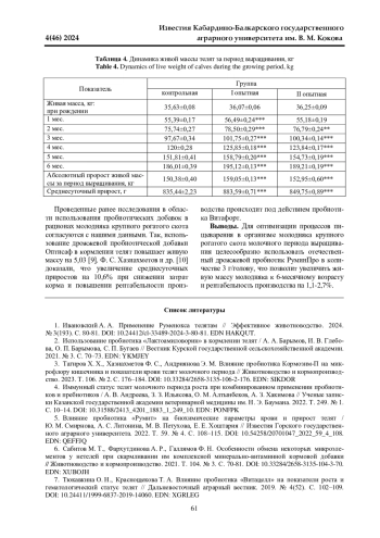 7. Тюкавкина О. Н., Краснощекова Т. А. Влияние пробиотика “Витацелл” на показатели роста и гематологический статус телят // Дальневосточный аграрный вестник. 2019. № 4(52). С. 102-109. DOI: 10.24411/1999-6837-2019-14060 EDN: XGRLEG