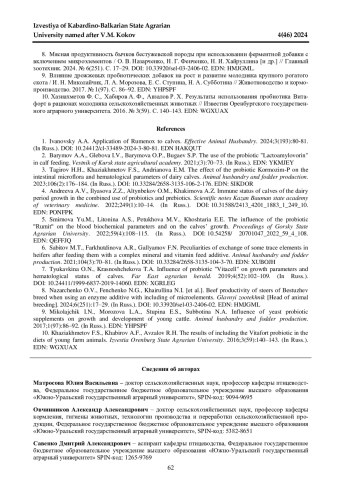 3. Тагиров Х. Х., Хазиахметов Ф. С., Андриянова Э. М. Влияние пробиотика Кормозим-П на микрофлору кишечника и показатели крови телят молочного периода // Животноводство и кормопроизводство. 2023. Т. 106. № 2. С. 176-184. DOI: 10.33284/2658-3135-106-2-176 EDN: SIKDOR
