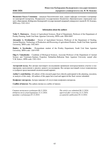 Исследование проводили с целью выявления целесообразной глубины насыпи подстилочного материала для выращивания перепелов на мясо. Работу выполняли в зимний период 2023-2024 гг. в условиях учебно-производственного птичника РГАУ-МСХА имени К. А. Тимирязева. Для этого методом пар-аналогов были сформированы 3 группы мясо-яичных перепелов маньчжурской породы по 57 голов в каждой. Птицу выращивали на глубокой подстилке с плотностью посадки 0,02 м2 на 1 голову при постоянном доступе к корму и воде в условиях нормативного микроклимата до 39-суточного возраста. Глубина насыпи подстилочного материала в группе I (контрольной) составляла 10 см; в группе II - 7 см; в группе III - 5 см. Выращивание перепелов на подстилке глубиной 5 см привело к увеличению сохранности поголовья в возрасте 5 суток в среднем на 4,0%; снижению расхода корма на 1 кг прироста живой массы за 2 недели выращивания на 1,59 кг; улучшению состояния подошвы стоп перепелов в среднем на 1,4 балла и качества подстилки на 2,5 балла. Существенной разности по продуктивности и мясным качествам между перепелами разных групп не наблюдали. Снижение глубины насыпи подстилки с 10 до 5 см позволяет при сохранении зоотехнической эффективности производства мяса перепелов сократить затраты на подстилочный материал и улучшить состояние подошвы стоп птицы.