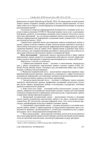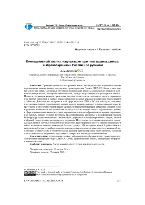 Проведен сравнительно-правовой анализ законодательства и практики защиты персональных данных пациентов в системе здравоохранения России, США, ЕС, Китая и ряда других азиатских стран. Основными методами исследования явились сравнительно-правовой, формально-юридический, экспертно-аналитический, методы визуализации и структурного анализа. Целью исследования является проведение анализа законодательства в сфере защиты персональных данных пациентов в системе здравоохранения в разных странах и выявление рекомендаций для России. Доказано, что лидерами в этой сфере являются США и ЕС, где действуют специальные законы о защите персональных данных в сфере здравоохранения, устанавливающие строгие требования к операторам медицинских данных и предусматривающие серьезные санкции за их нарушение. Отмечается, что российская законодательство в сфере защиты персональных данных в сфере здравоохранения соответствует мировым тенденциям цифровизации и защиты персональных данных, однако имеются проблемы правоприменения, связанные с недофинансированием IT-инфраструктуры медицинских организаций, дефицитом квалифицированных кадров, низкой цифровой грамотностью медицинского персонала. Полученные результаты формируют основу для дальнейших научных изысканий по проблемам трансформации систем охраны медицинской тайны в контексте развития технологий больших данных, ИИ, интернета вещей. В работе обоснована целесообразность дифференциации правового регулирования в зависимости от категорий информации (генетических и биометрических данных), аргументирована необходимость усиления ответственности за нарушения, предложены конкретные законодательные новеллы.