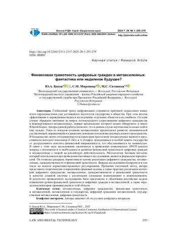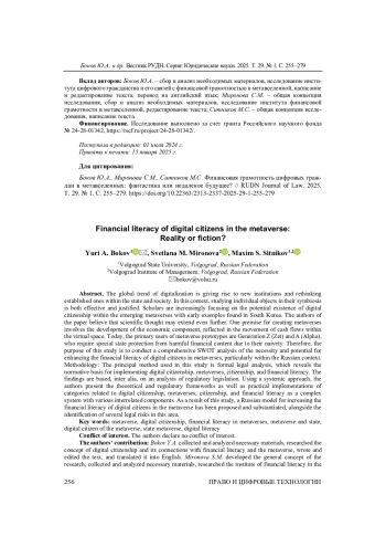 Глобальный тренд цифровизации становится причиной осмысления новых и/или переосмысления уже устоявшихся институтов государства и общества. При этом вполне эффективным и оправданным видится исследование отдельных объектов в их симбиозе. Сегодня ученые обращают внимание на вопрос потенциального существования цифрового гражданства в формирующихся метавселенных, первые предпосылки которого можно обнаружить в опыте Южной Кореи. Авторы данной работы полагают, что в данном случае научная мысль может пойти еще дальше. Один из посылов создания метавселенных предполагает развитие экономической составляющей, выражающейся в движении денежных потоков внутри виртуального пространства. В большинстве своем сегодняшними пользователями прототипов метавселенных являются представители молодого поколения Z (Зет) и А (Альфа), нуждающиеся в особой защите государства от деструктивного контента финансовой направленности, что обуславливается их наивностью. В связи с этим цель исследования заключается в проведении комплексного SWOT-анализа вопроса о возможности и необходимости развития финансовой грамотности цифровых граждан в метавселенных с опорой на российскую действительность. Методология: Базовым методом, который использовался при проведении настоящего исследования, является формально-юридический. Он позволил раскрыть нормативную основу реализации цифрового гражданства, метавселенных, гражданственности и финансовой грамотности. Выводы исследования базируются в том числе на анализе нормативно-правового регулирования. Применяя системный метод, авторы представили теоретические и нормативно-правовые основы, а также практику реализации категорий цифрового гражданства, метавселенных, гражданственности и финансовой грамотности в качестве сложной системы с различными сложными взаимосвязями и взаимовлиянием. В результате проведенного исследования была предложена и обоснована российская модель повышения уровня финансовой грамотности цифровых граждан в метавселенной, а также определены некоторые правовые риски в этой области.
