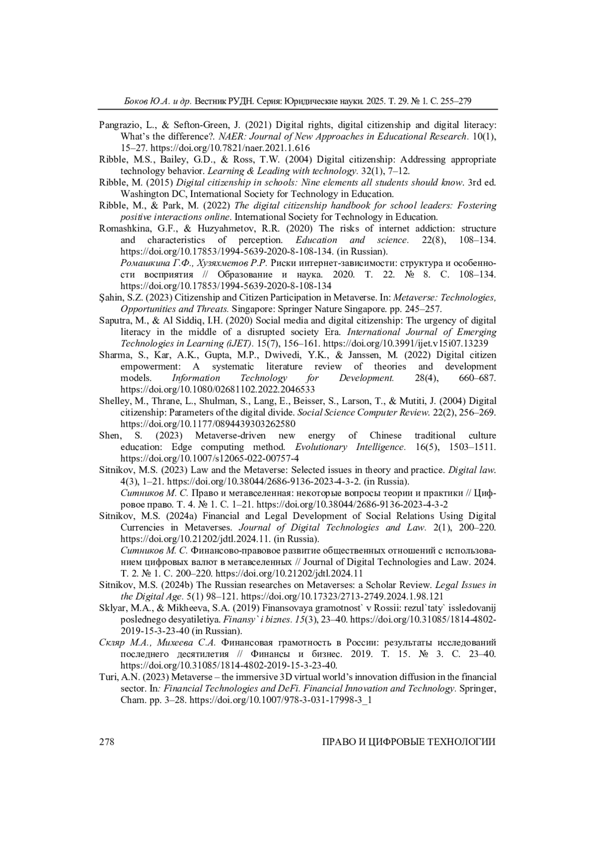 42. Sitnikov, M.S. (2024b) The Russian researches on Metaverses: a Scholar Review. Legal Issues in the Digital Age. 5(1) 98-121. DOI: 10.17323/2713-2749.2024.1.98.121 EDN: AFBABW