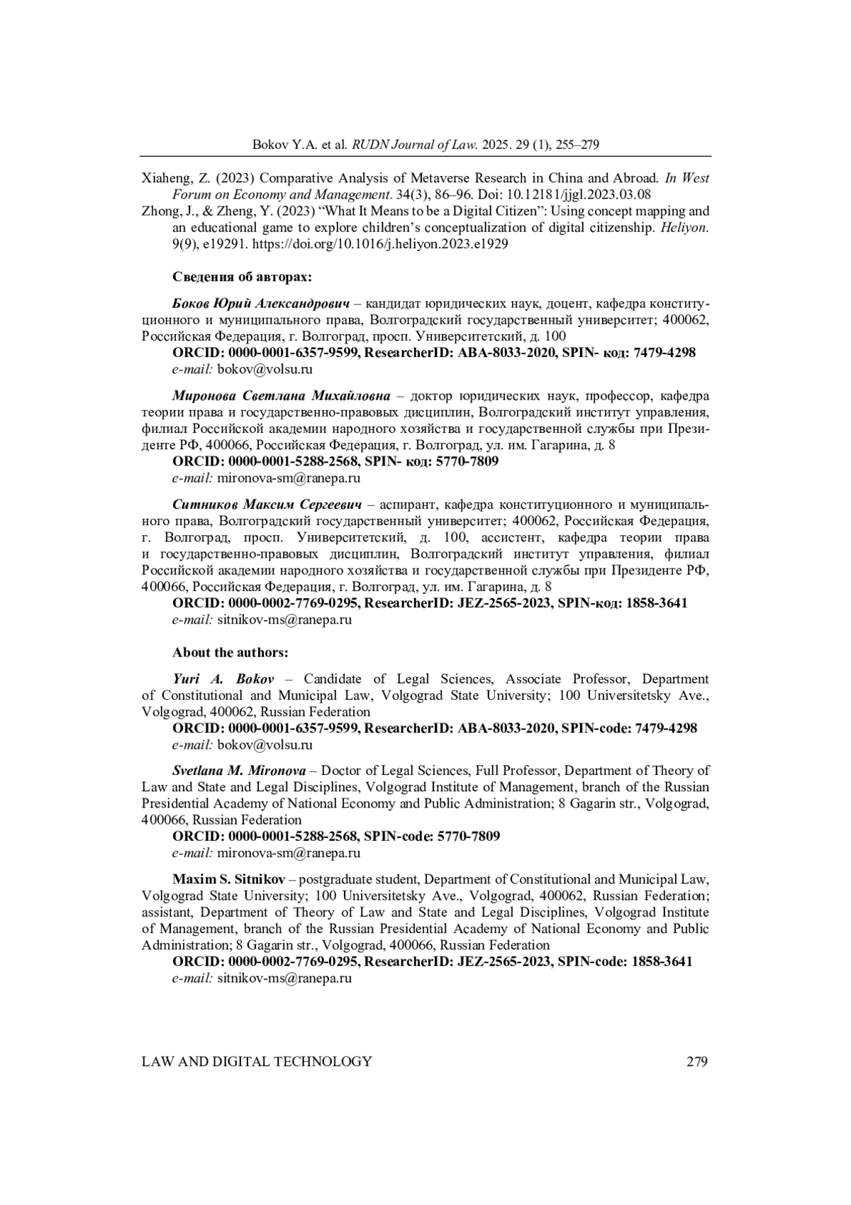 3. Bokov, Y.A., & Abezin, D.A. (2020) Digital citizenship: Implementation in the modern world. Lecture Notes in Networks and Systems. Vol. 110. P. 442-448. DOI: 10.1007/978-3-030-45913-0_52 EDN: PUFSCW
