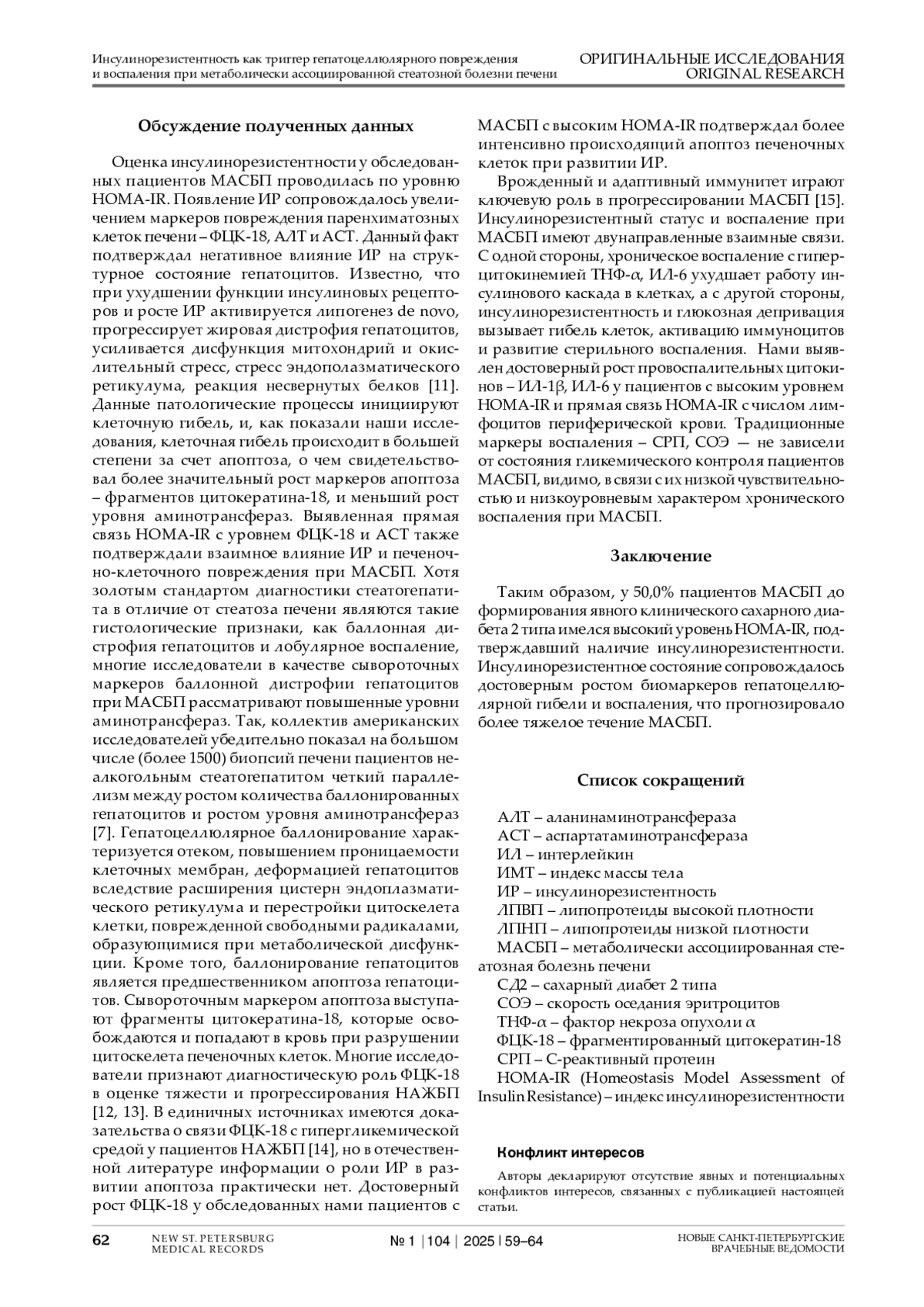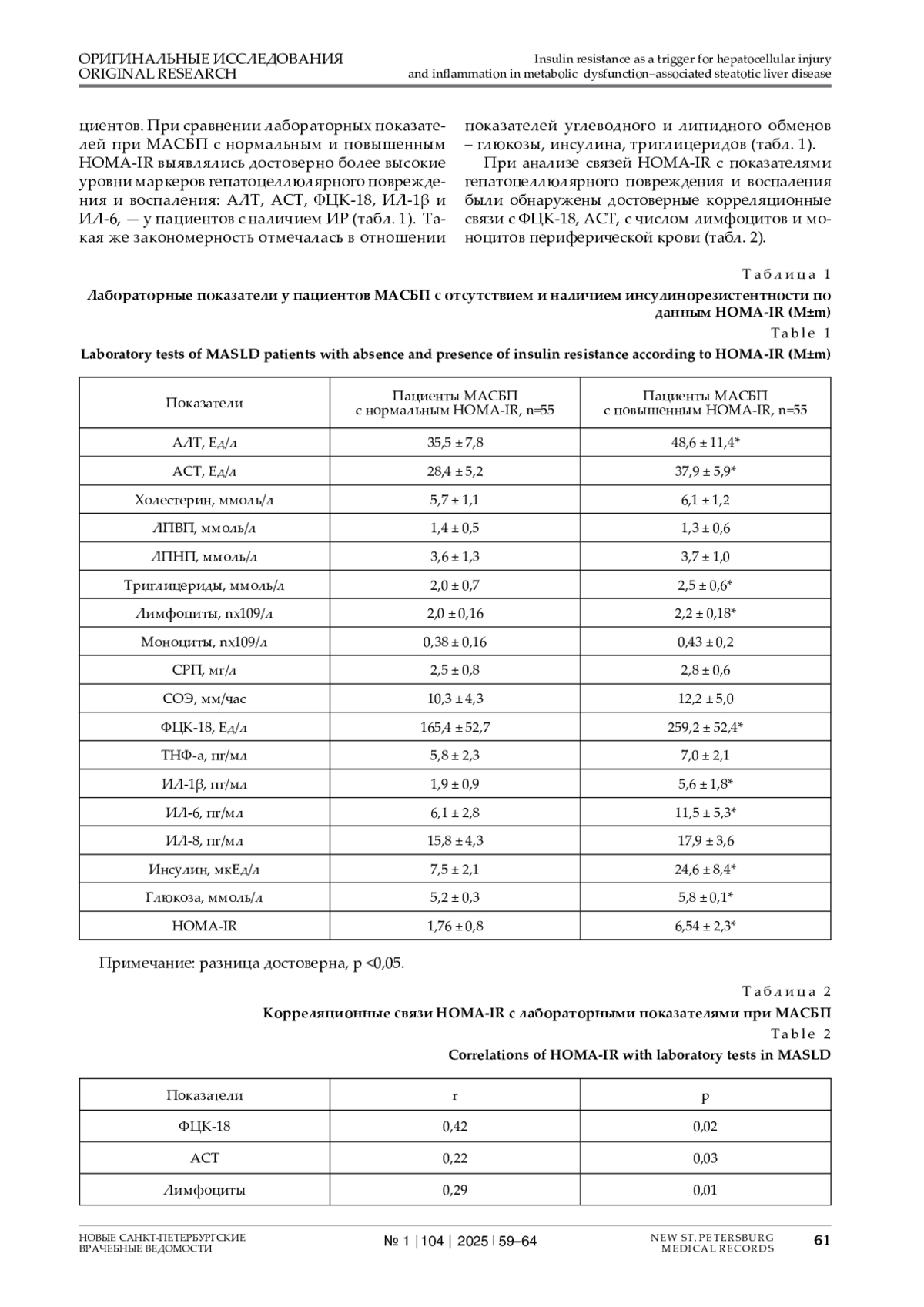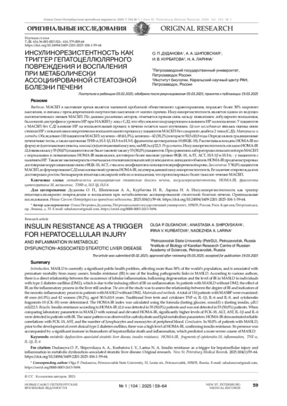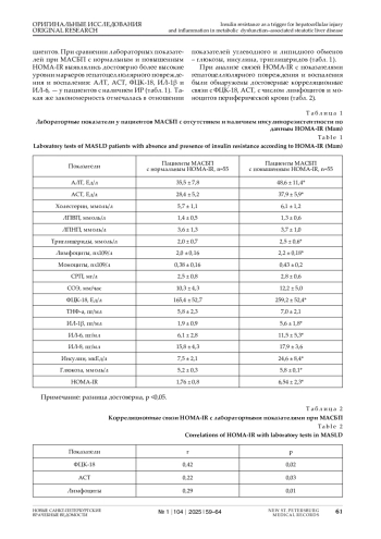 Введение. МАСБП в настоящее время является значимой проблемой общественного здравоохранения, поражает более 30% мирового населения, и связана с преждевременной смертностью населения от многих причин. Инсулинорезистентность является одним из ведущих патогенетических звеньев МАСБП. По данным различных авторов, отмечается прямая связь между появлением лобулярного воспаления, баллонной дистрофии и уровнем ИР при НАЖБП у лиц с СД2, что обусловлено индуцирующим влиянием ИР на воспаление. У пациентов c МАСБП без СД2 влияние ИР на воспалительный процесс в печени остается мало изученным. Целью исследования явилась оценка связи степени ИР с показателями некротически-воспалительного процесса у пациентов МАСБП без сахарного диабета 2 типа (СД2). Материалы и методы. Обследовано 110 пациентов МАСБП: мужчин – 68 (61,8%), женщин – 42 (38,2%) в возрасте 50,5±10,8 года. Определялись традиционные печеночные тесты, а также цитокины ТНФ-α, ИЛ-1β, ИЛ-6 и ИЛ-8, фрагменты цитокератина-18 (ФЦК-18). Рассчитывался индекс HOMA-IR по формуле (натощаковая глюкоза, ммоль/л)х(натощаковый инсулин, мкМЕ/мл)/22,5. Результаты. Инсулинорезистентность согласно HOMA-IR ≥2,6 выявлялась у 55 (50,0%) пациентов и не было таковой также у 55 (50,0%) пациентов. При сравнении лабораторных показателей при МАСБП с нормальным и повышенным HOMA-IR выявлялись достоверно более высокие уровни ФЦК-18, АЛТ, АСТ, ИЛ-1β и ИЛ-6, - у пациентов с наличием ИР. Такая же закономерность отмечалась в отношении показателей углеводного и липидного обменов. HOMA-IR продемонстрировал достоверные корреляционные связи с ФЦК-18, АСТ, с числом лимфоцитов и моноцитов периферической крови. Заключение. У 50,0% пациентов МАСБП до формирования СД2 имелся высокий уровень HOMA-IR, подтверждавший инсулинорезистентность. Ее наличие сопровождалось достоверным ростом биомаркеров гепатоцеллюлярной гибели и воспаления, что прогнозировало более тяжелое течение МАСБП.