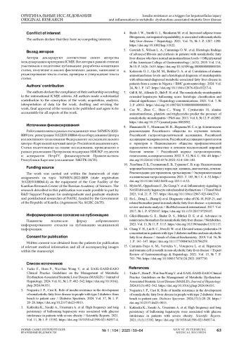 6. Kolawole O. J., Oje M. M., Betiku O. A. et al. Correlation of alanine aminotransferase levels and a histological diagnosis of steatohepatitis with ultrasound-diagnosed metabolic-associated fatty liver disease in patients from a centre in Nigeria // BMC gastroenterology. 2024. Vol. 24, № 1. P. 147. DOI: 10.1186/s12876-024-03237-4