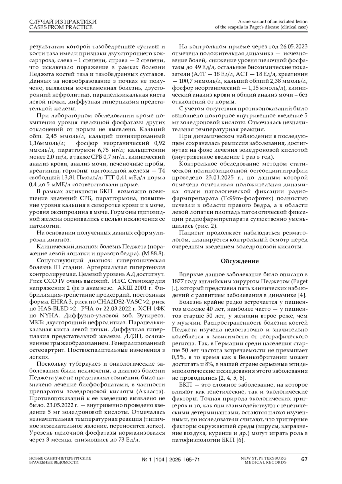 Статья: РЕДКИЙ ВАРИАНТ ИЗОЛИРОВАННОГО ПОРАЖЕНИЯ ЛОПАТОЧНОЙ КОСТИ ПРИ БОЛЕЗНИ ПЕДЖЕТА (КЛИНИЧЕСКИЙ СЛУЧАЙ) (2025)