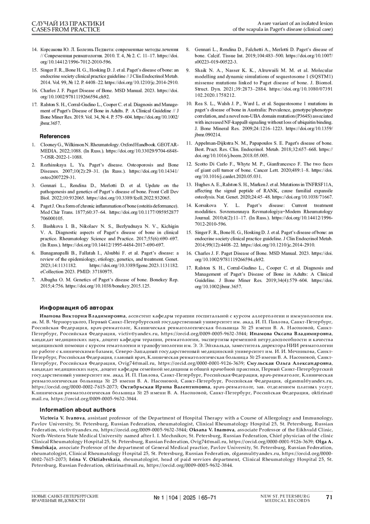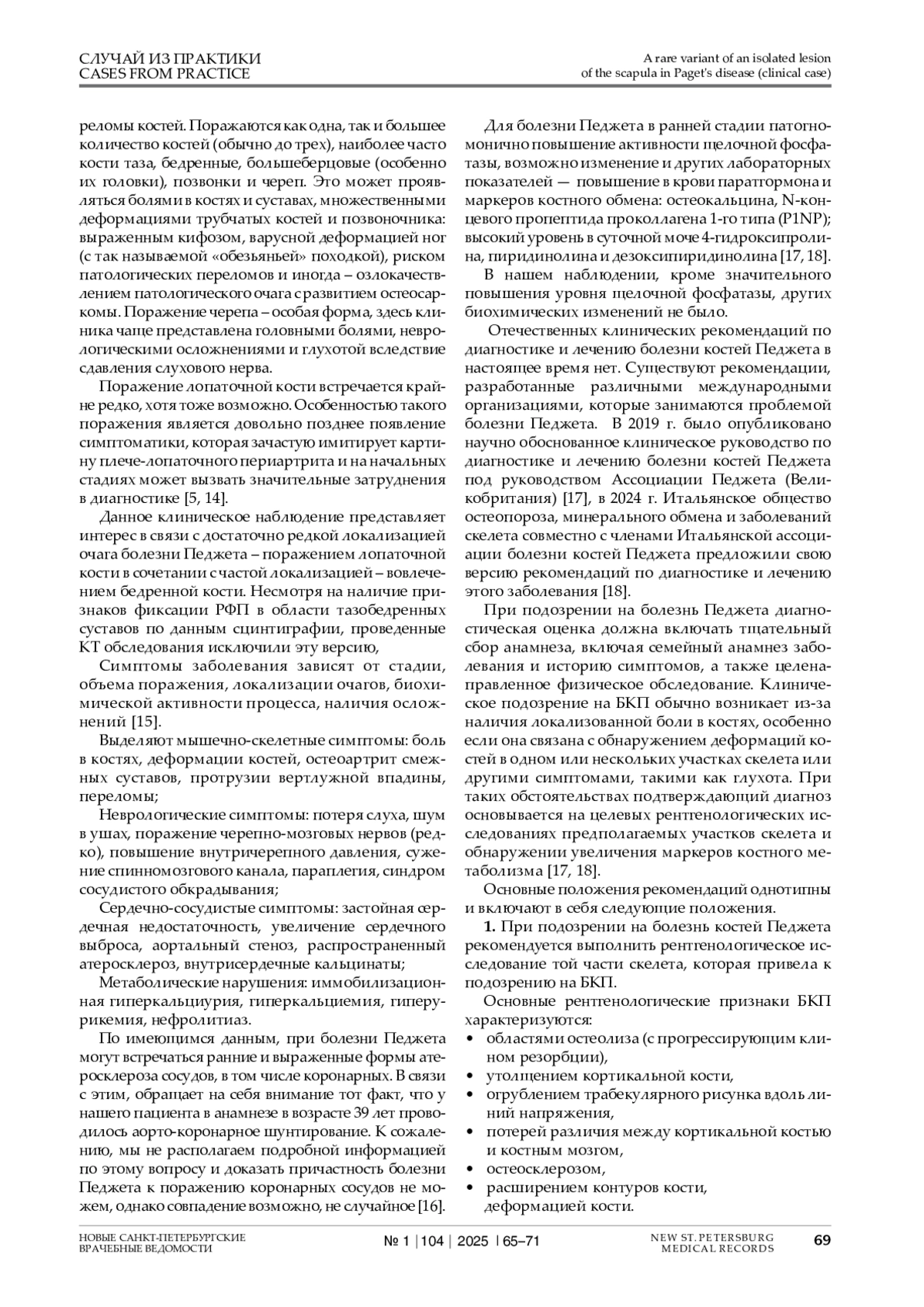 ИВАНОВА В. В., ИНАМОВА О. В., СМУЛЬСКАЯ О. А., ОКТЯБРЬСКАЯ И. В. РЕДКИЙ ВАРИАНТ ИЗОЛИРОВАННОГО ПОРАЖЕНИЯ ЛОПАТОЧНОЙ КОСТИ ПРИ БОЛЕЗНИ ПЕДЖЕТА (КЛИНИЧЕСКИЙ СЛУЧАЙ) // НОВЫЕ САНКТ-ПЕТЕРБУРГСКИЕ ВРАЧЕБНЫЕ ВЕДОМОСТИ. 2025. № 1, ТОМ 104