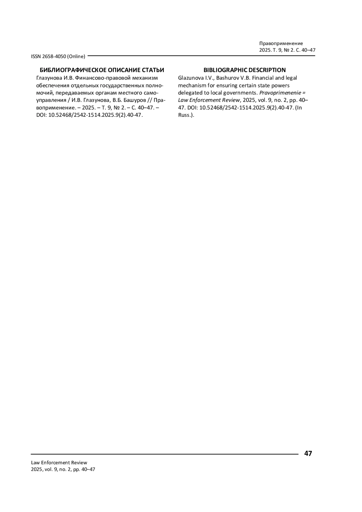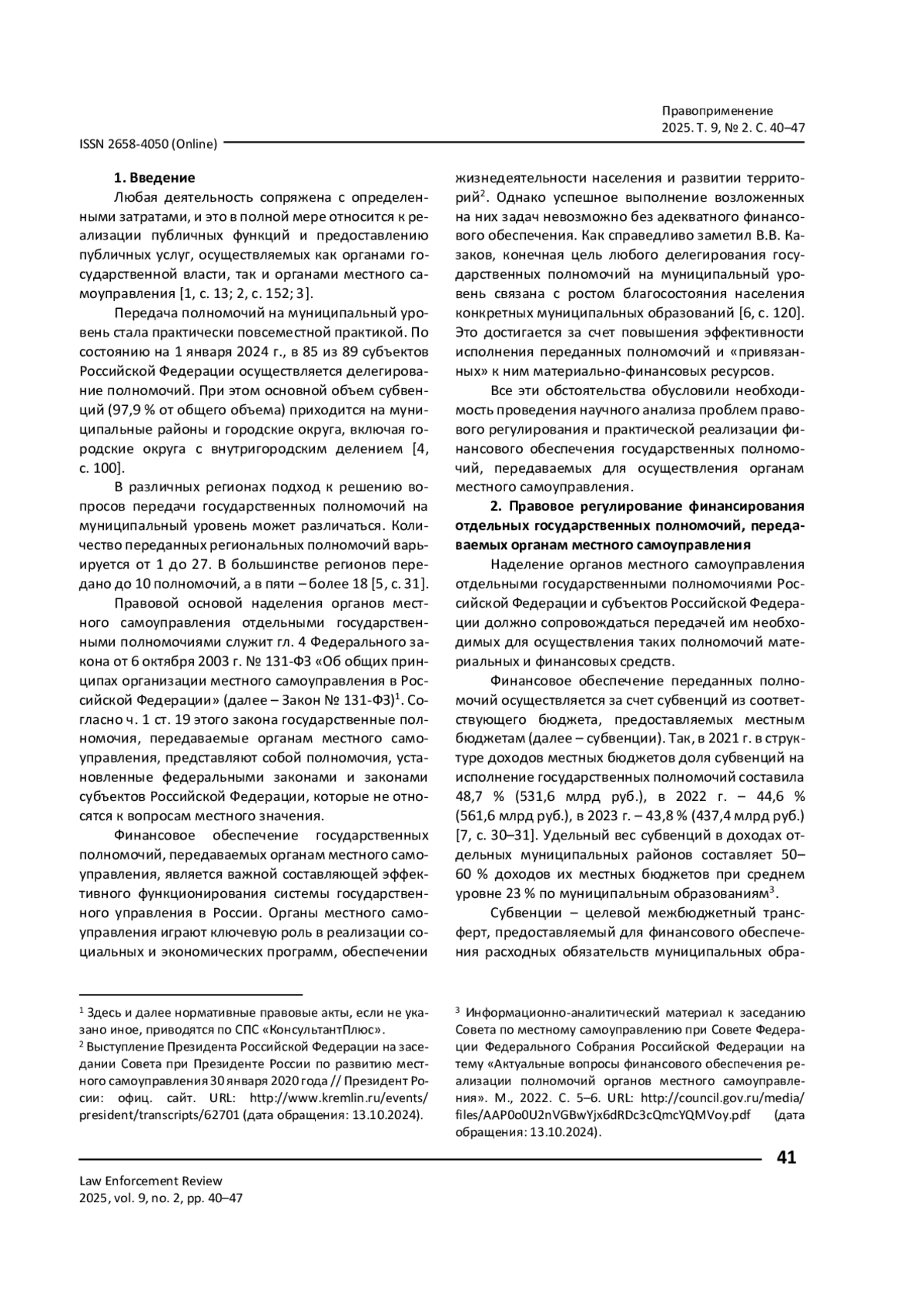 ГЛАЗУНОВА И. В., БАШУРОВ В. Б. ФИНАНСОВО-ПРАВОВОЙ МЕХАНИЗМ ОБЕСПЕЧЕНИЯ ОТДЕЛЬНЫХ ГОСУДАРСТВЕННЫХ ПОЛНОМОЧИЙ, ПЕРЕДАВАЕМЫХ ОРГАНАМ МЕСТНОГО САМОУПРАВЛЕНИЯ // ПРАВОПРИМЕНЕНИЕ. 2025. ТОМ 9, № 2