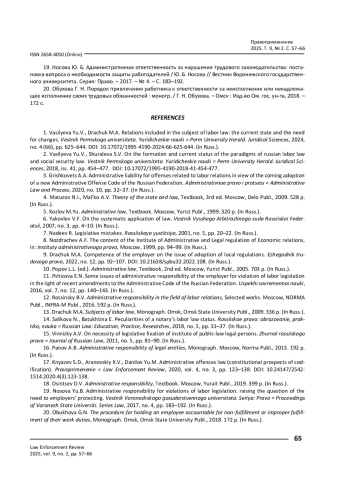 3. Гришковец А. А. Административная ответственность за правонарушения в сфере трудовых отношений в свете предстоящего принятия Кодекса Российской Федерации об административных правонарушениях / А. А. Гришковец // Административное право и процесс. - 2020. - № 10. - С. 32-37.