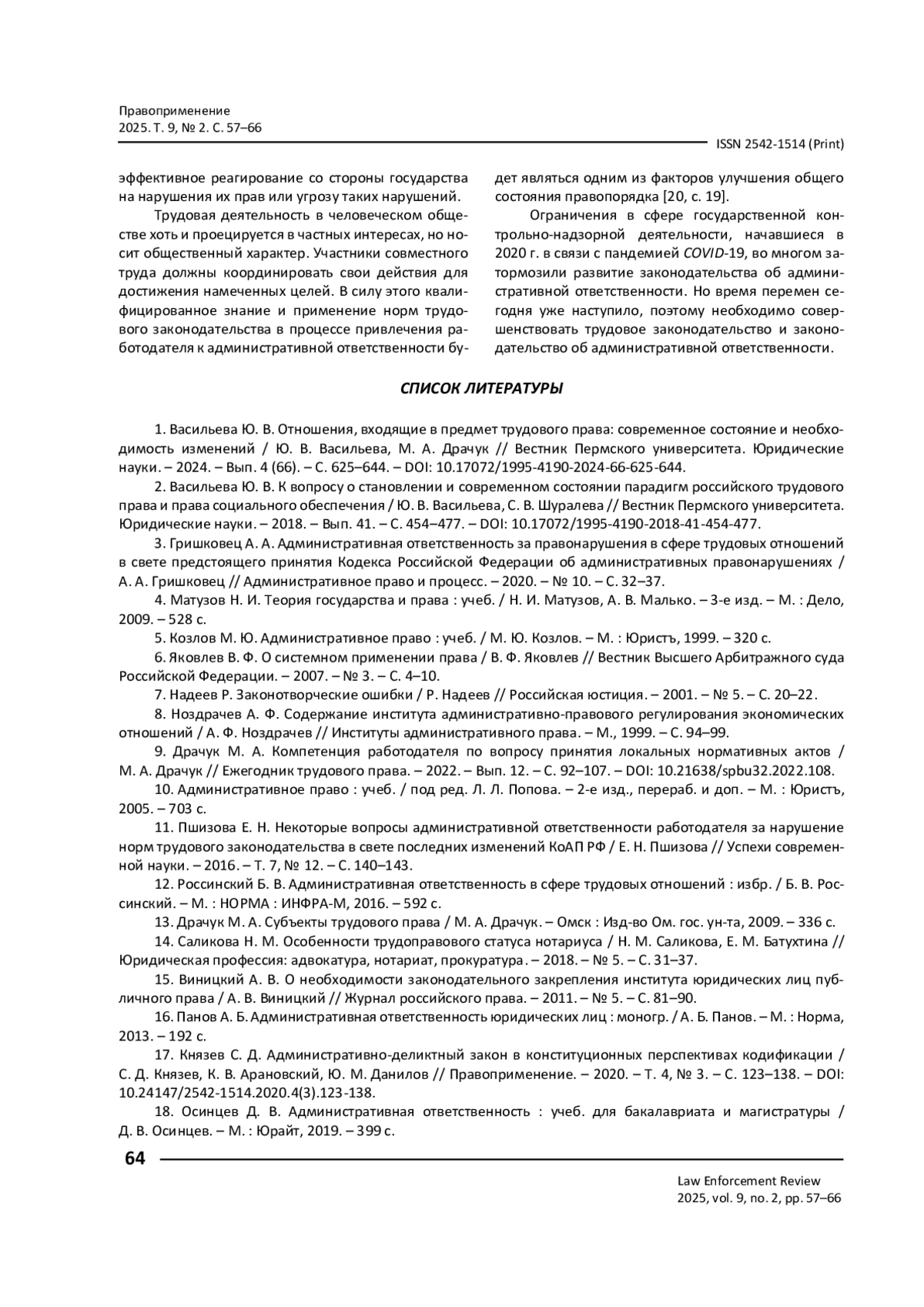 9. Драчук М. А. Компетенция работодателя по вопросу принятия локальных нормативных актов / М. А. Драчук // Ежегодник трудового права. - 2022. - Вып. 12. - С. 92-107. - https://doi.org/10.21638/spbu32.2022.108.