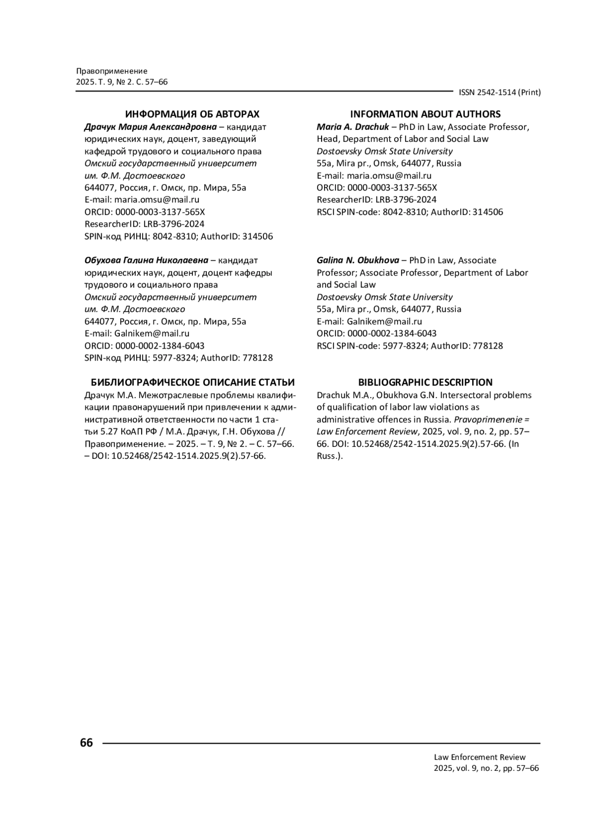 19. Носова Ю. Б. Административная ответственность за нарушения трудового законодательства: постановка вопроса о необходимости защиты работодателей / Ю. Б. Носова // Вестник Воронежского государственного университета. Серия: Право. - 2017. - № 4. - С. 183-192.
