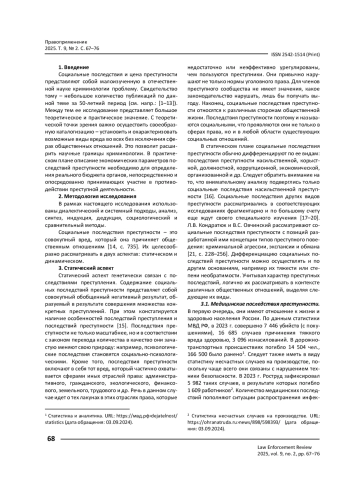 Утверждается, что социальные последствия преступности целесообразно рассматривать в двух аспектах: статическом и динамическом. В статическом плане социальные последствия преступности дифференцируются на медицинские, демографические, социально-психологические, экологические, биологические, культурологические, юридические, политические и экономические. Экономические последствия имеют стоимостное выражение, поэтому они и есть цена преступности. Динамический аспект социальных последствий преступности познаётся через феномен криминализации общественных отношений, конечным итогом которой является тотальное разрушение государства. Делается вывод, что в настоящее время наиболее актуально изучение экономических последствий преступности, что и является ее измеряемой ценой.