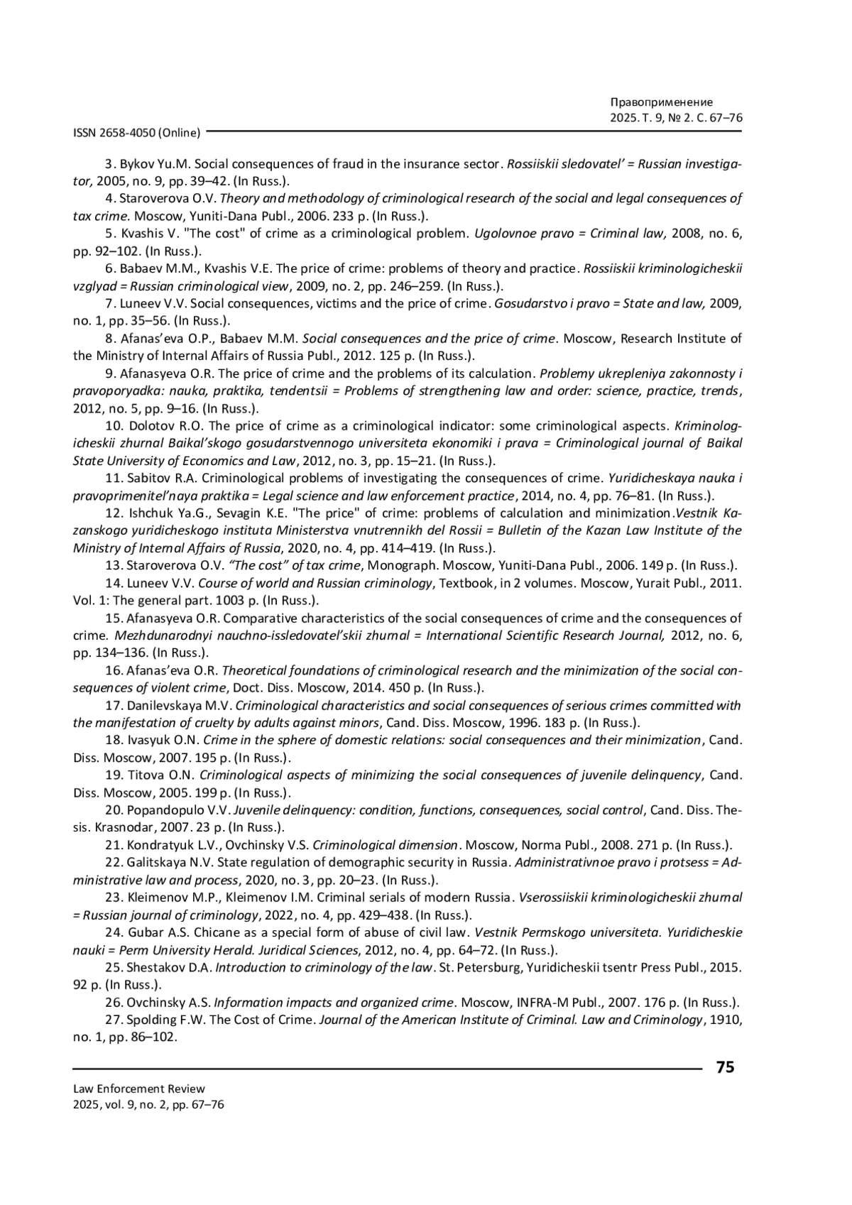 9. Афанасьева О. Р. Цена преступности и проблемы ее исчисления / О. Р. Афанасьева // Проблемы укрепления законности и правопорядка: наука, практика, тенденции. - 2012. - № 5. - С. 9-16.